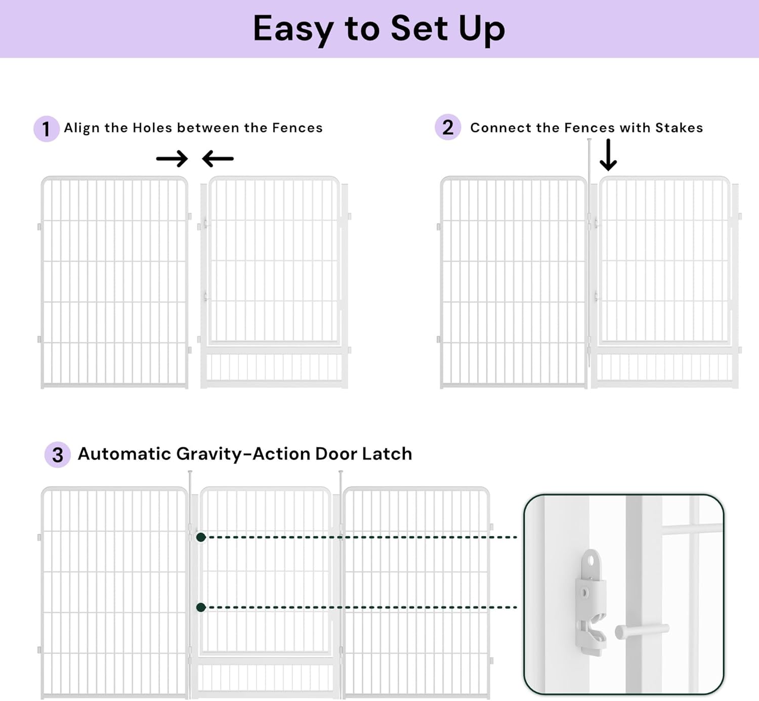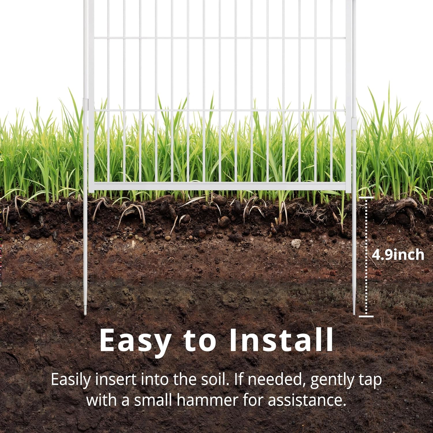 - Easy to Assemble: Say goodbye to complicated assembly! Garden fence with gate could be assembled in just a few minutes without tools, you only need to put the two fence panels facing out and align the rings, and finally insert the pole into the ring to fix it. The pole easily inserts into the soil, providing great stability