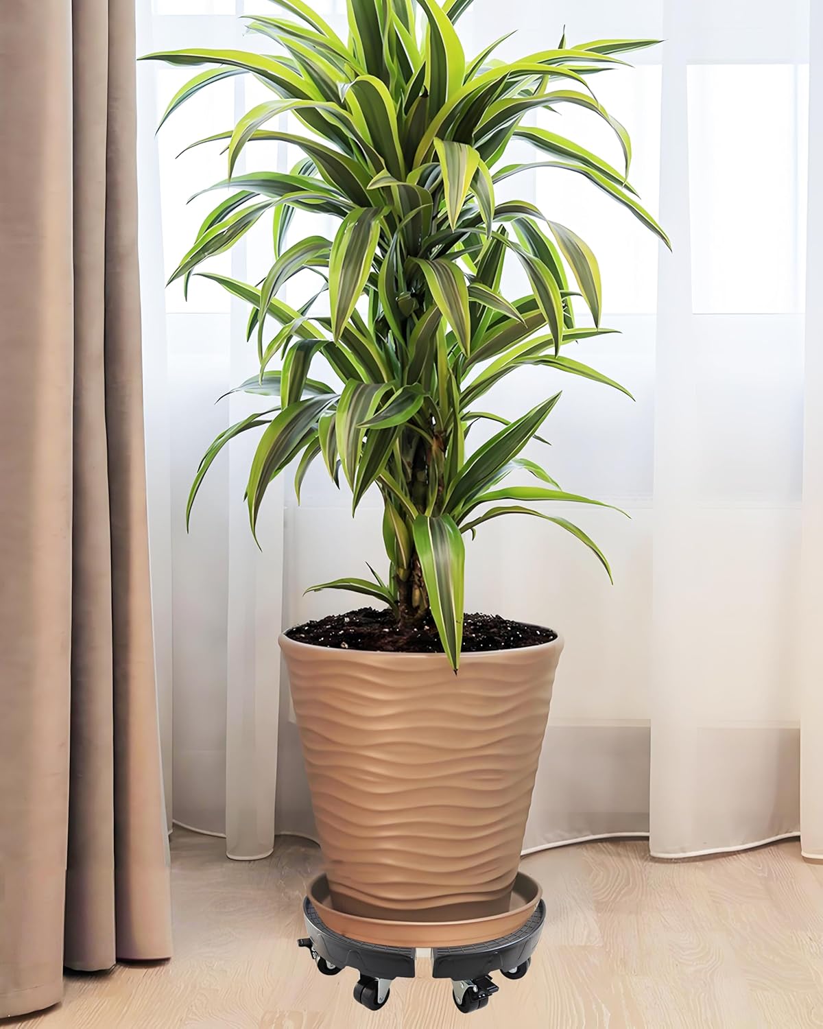 - 【Sturdy Design】This upgrated planter cart is made of enlarged UV-resistant plastic panel, large section stainless steel pipe, and 8 heavy duty twin-wheels, moving heavy object quite easily and labor-saving. Anti slip stripes and guardrail on round base can prevent the flowerpot from sliding, avoid the risk of flowerpot falling.