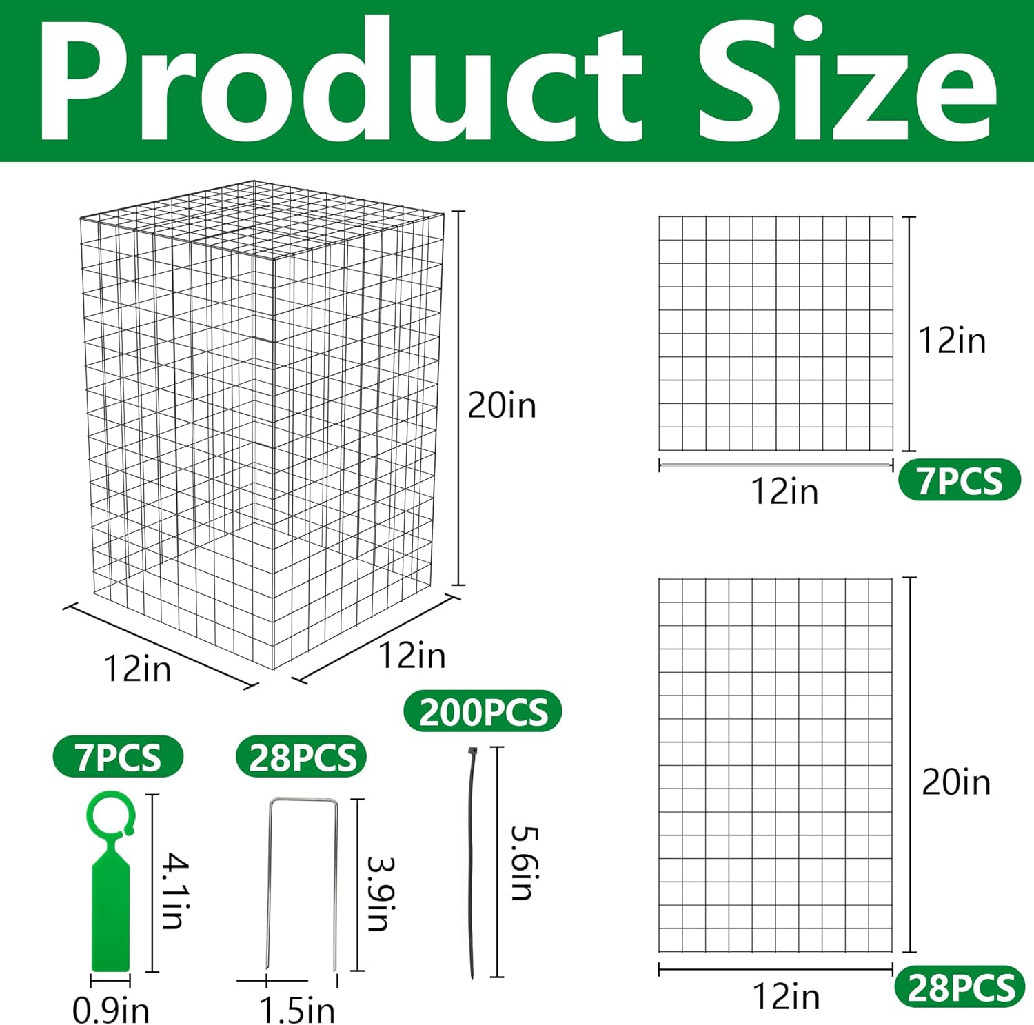 - Plant Cage Set:You will receive 7 set of metal mesh plant protectors measuring 12 inches high by 12 inches long on the bottom edge,including 28 sheets of wire mesh plant protector panels, 28 pieces of ground stakes,7 pieces of label clips,7 pieces of cover and 200 pieces of nylon cable ties,which is enough to guard the fruits of your labor with full protection.