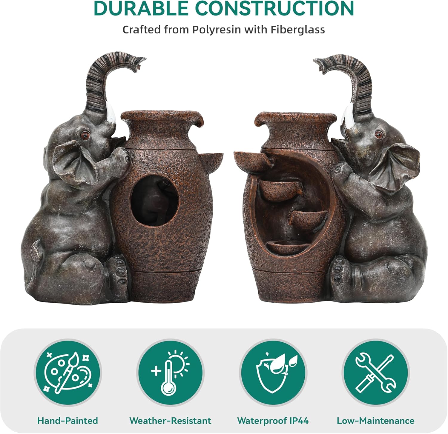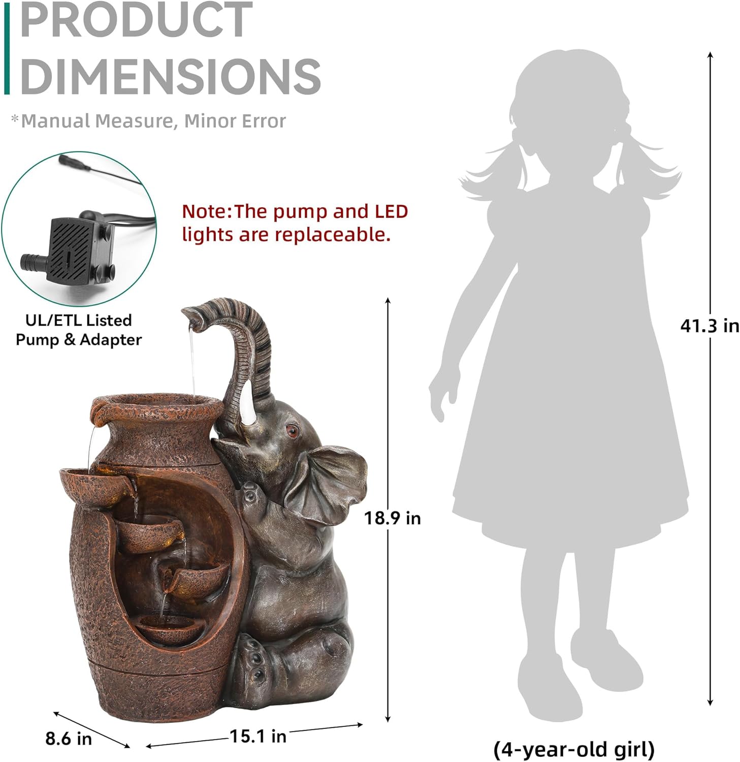 Elephant Outdoor Water Fountain with LED Lights and Pump, 18.9" Tall Resin Garden Waterfall Feature for Patio, Porch, Yard