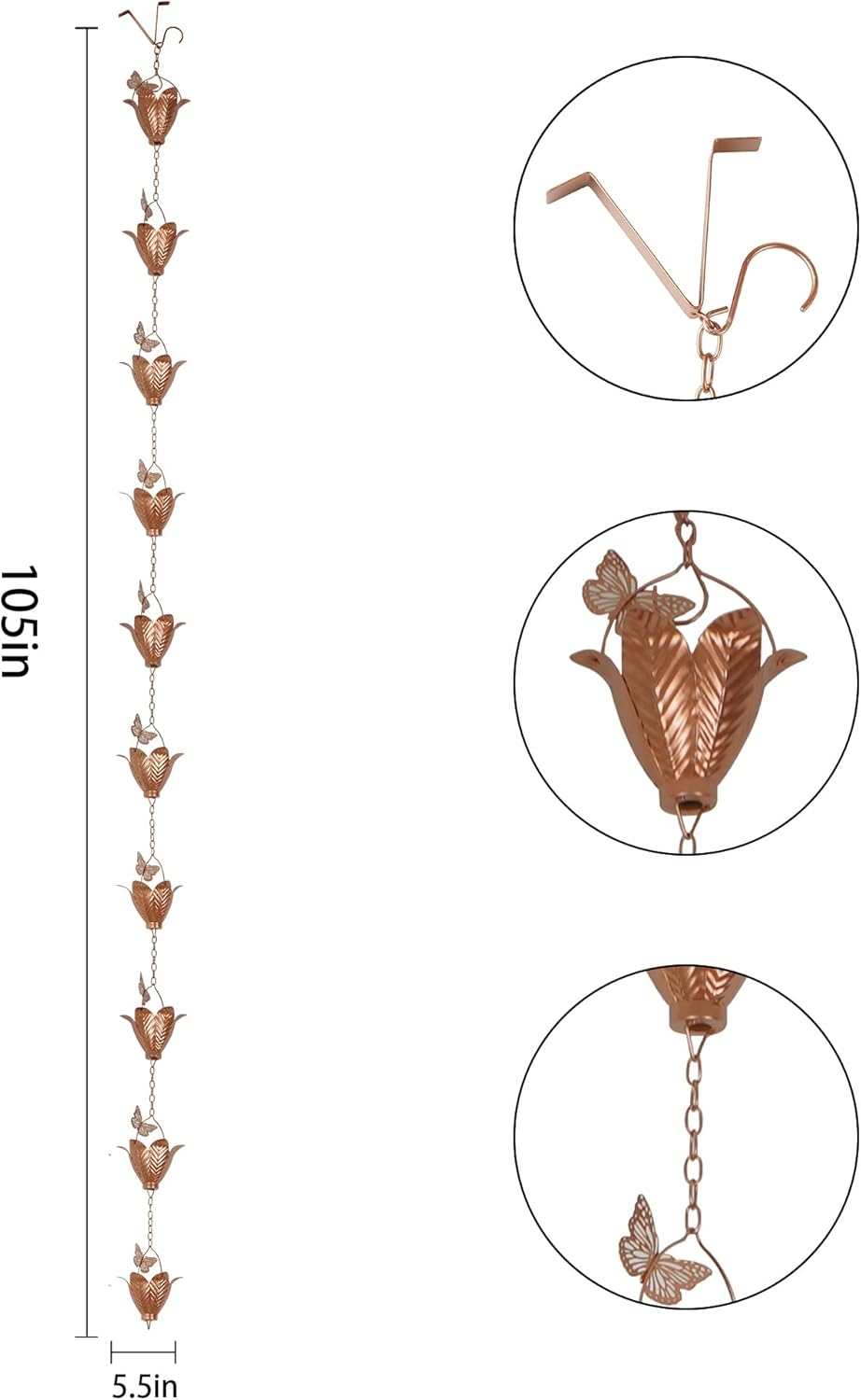 - 【Elegant Alternatives】 The rain chain is composed of 10 Flower Cups with Butterfly cups and is sized to fit standard single-story buildings. The unique design adds a chic touch to roofs and awning nests. It is an elegant alternative to traditional gutter downspouts