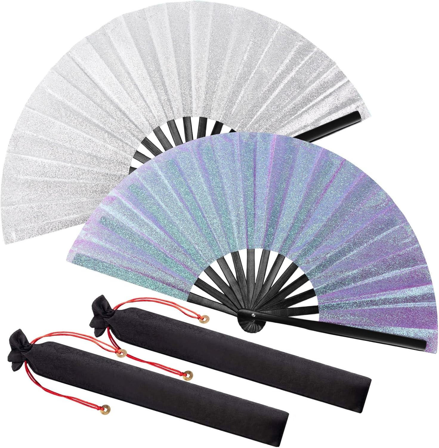 Maitys 2 Packs Large Clap Fans for Line Dancing Large Chinese Folding Hand Fans for Men and Women, Festival, Tai Ji, Kungfu, Martial Art, Gifts (Glitter Sliver and Purple)