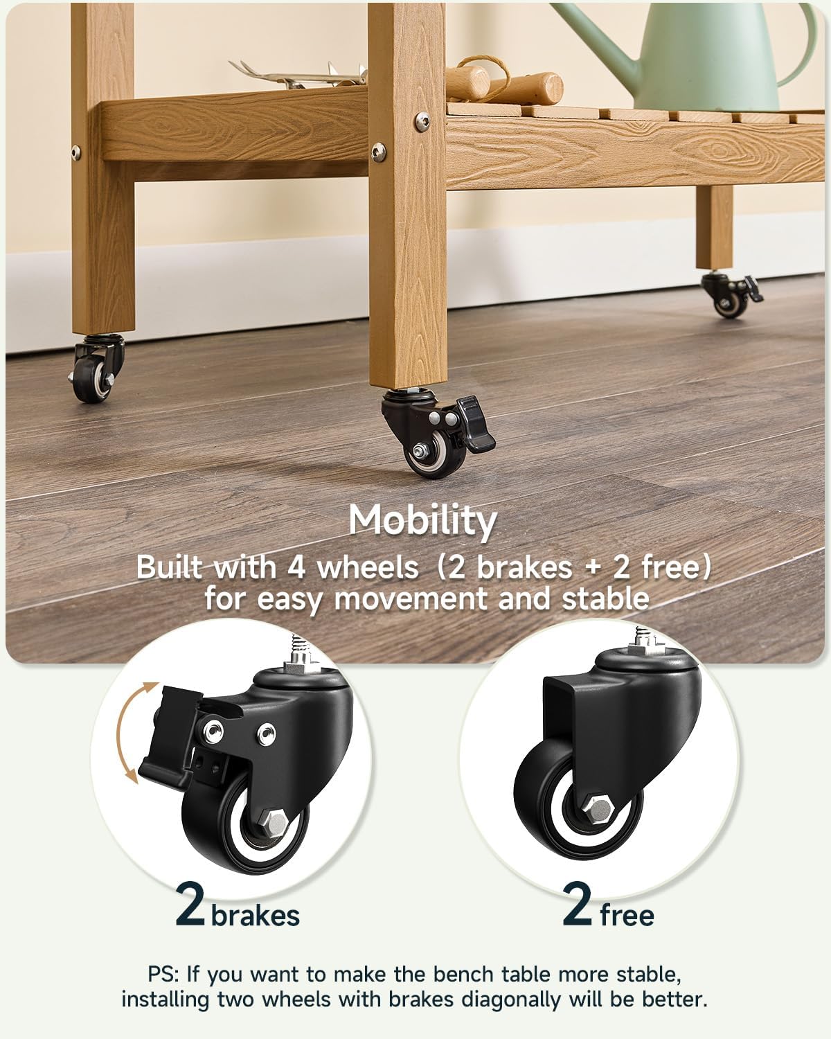 - Mobility - Built with 4 wheels(2 brakes + 2 free)for easy movement and stable. If you want to make the bench table more stable, installing two wheels with brakes diagonally will be better