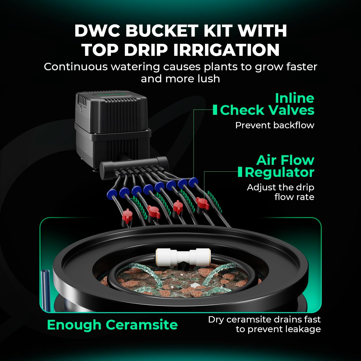 - 【UPGRADED DWC HYDROPONIC SYSTEM WITH TOP DRIP KIT】 This DWC bucket system features a unique top drip design for enhanced water circulation. The continuous water flow making it easier for plants to absorb essential nutrients. the top drip kit ensures steady water renewal, reducing the risk of stagnation and nutrient imbalance