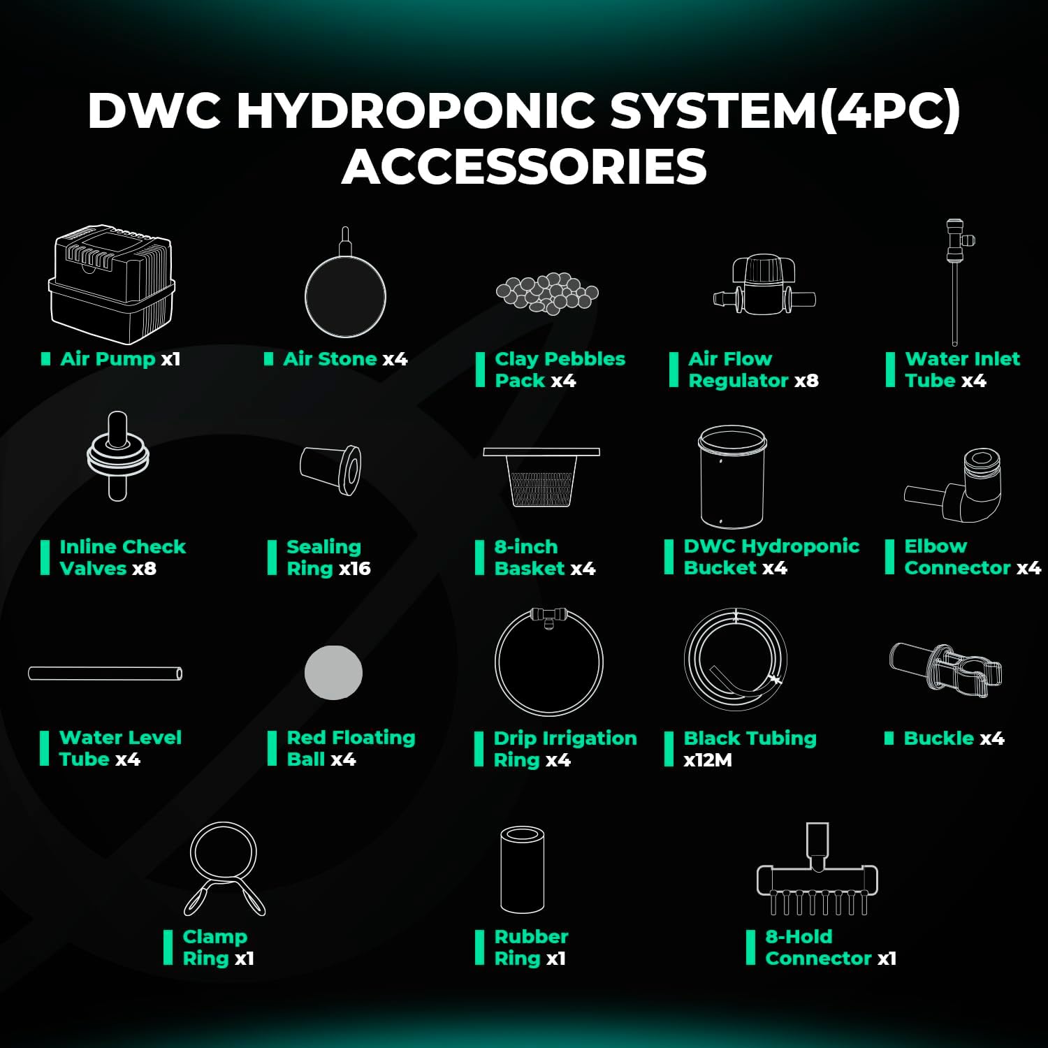 - 【DWC HYDROPONICS SYSTEM INCLUDE】4x 5-Gallon DWC Buckets, 1x 11W Air Pump, 4x 8-inch baskets, 4x Air Stone, 4x Top Drip Kit, 1x 12M Air Tubes, 4x Visual Water Level Indicators, 8x Check Valve, 8x Air Flow Regulator, 4x Clay Pebbles, user manual and other accessories