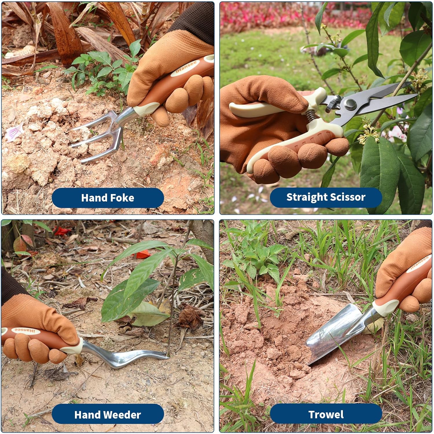 - Durable and Rust-Resistant Garden Tools: Crafted from aluminum alloy, iHansee gardening tools are lightweight yet strong, offering long-lasting durability and rust resistance. Each tool has an ergonomic concave-convex handle made of PP+TPR for a comfortable grip. Designed to reduce strain on wrists and hands, the handles provide excellent leverage for digging, planting, and weeding.