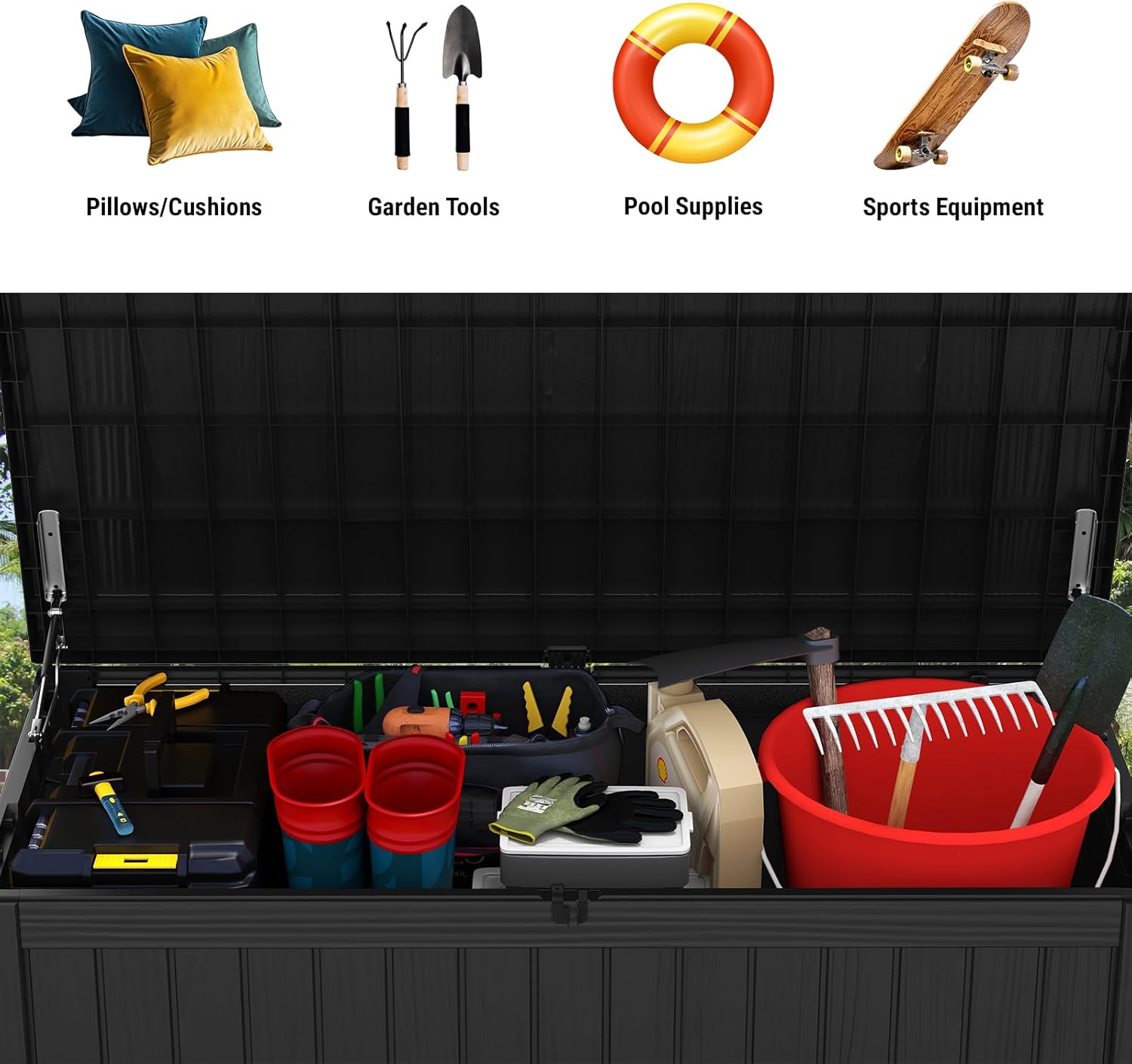 - 【Smooth & Secure Operation】- Equipped with dual side hydraulic hinges, the lid opens effortlessly and remains in place for easy access to your items. The slow-closing mechanism ensures safe operation for all family members, while the lockable lid (lock not included) provides an additional layer of security for your outdoor essentials