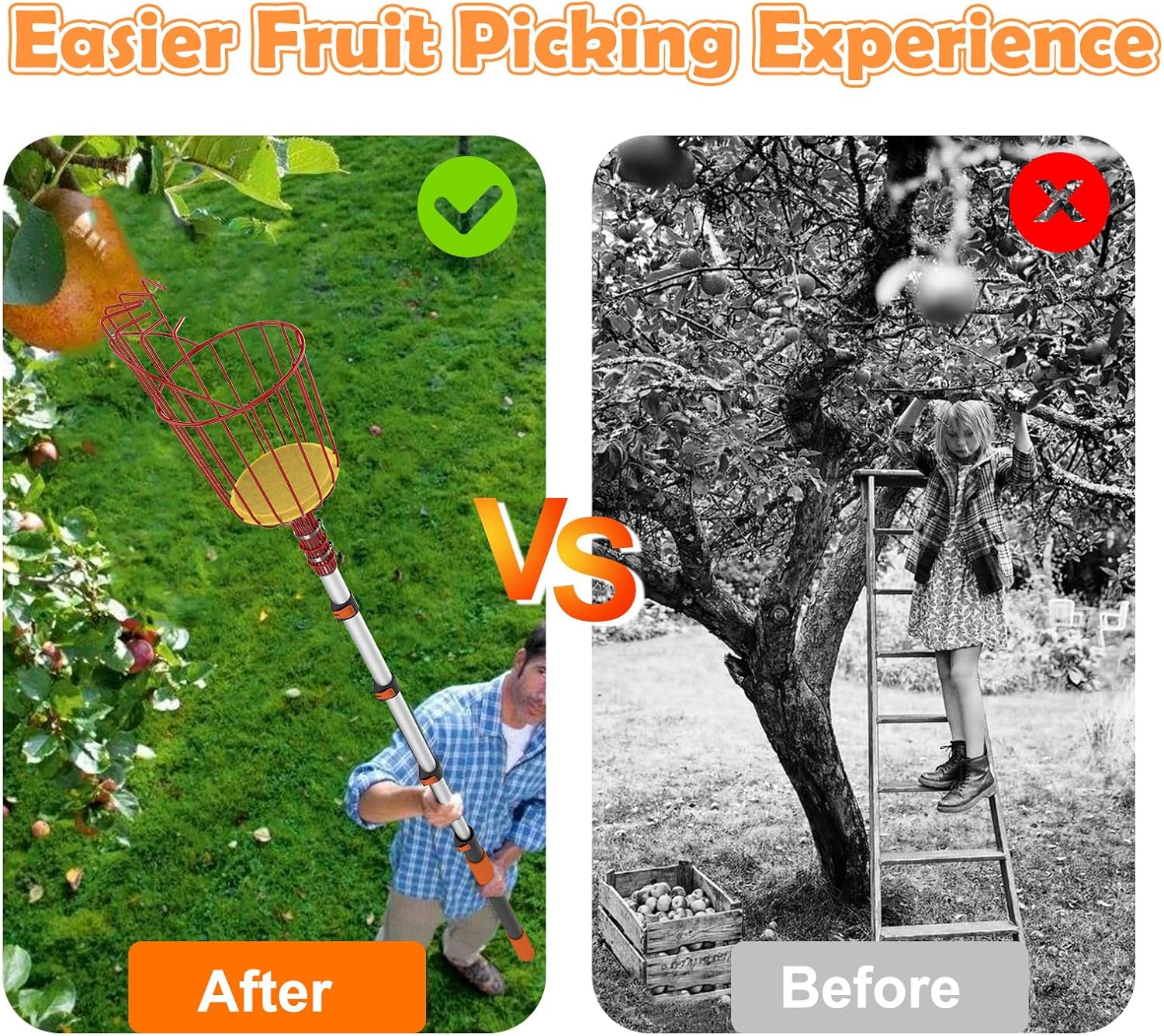 - Long Telescoping Reach: With 3-12FT telescopic extension pole (20FT reach), this fruit picker pole with basket telescoping allows you to reach fruits on tall trees effortlessly, acting as a reliable fruit tree picker tool. Whether you use it as an apple picker or an orange picker, it ensures a safe and efficient picking experience without the need for a ladder.
