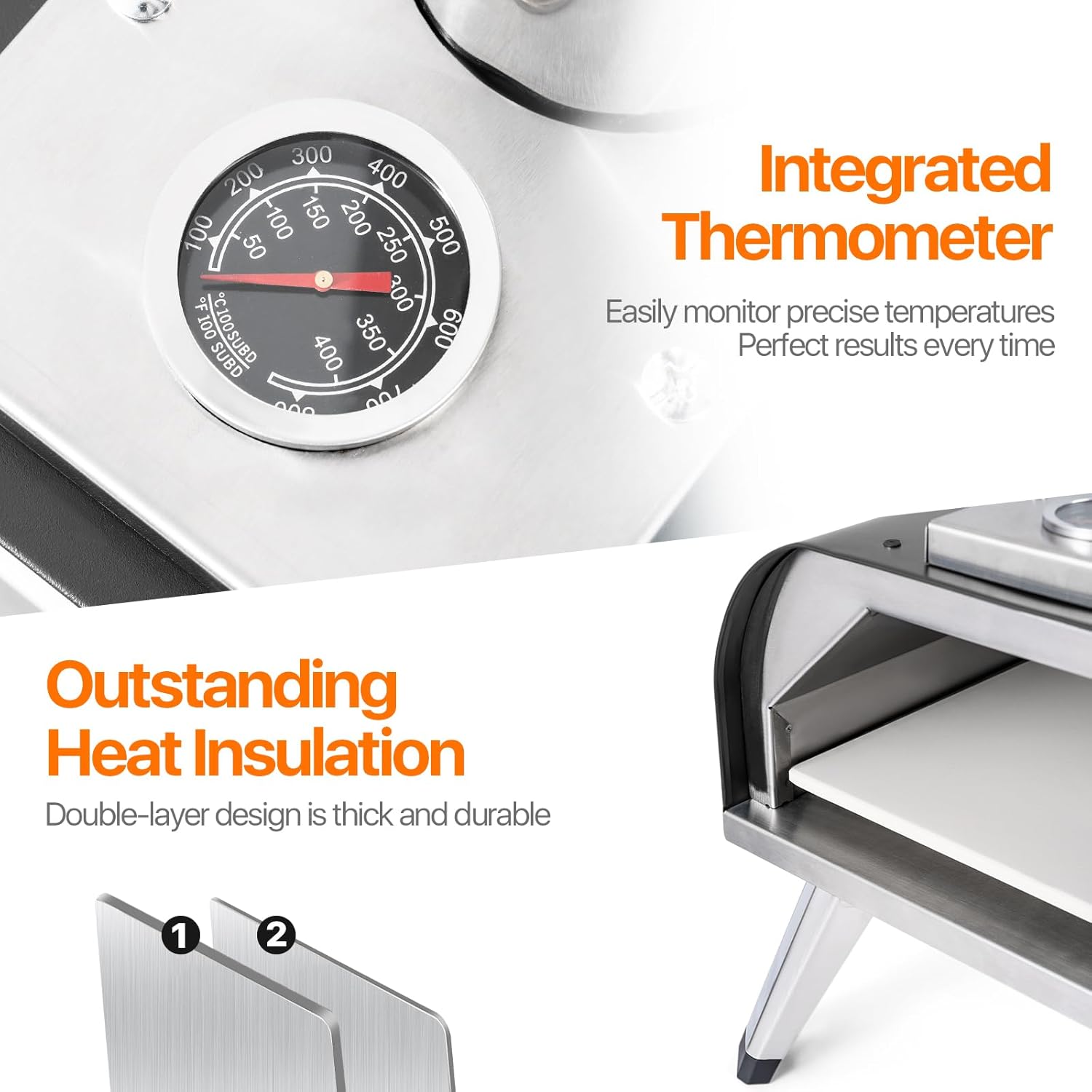 - Premium & Safe:The pizza oven is made of premium 430 stainless steel and cold rolled sheet metal for thickness and durability, this double insulated construction provides excellent heat retention and combines with the natural efficiency of wood fuel for an efficient cooking experience. The pizza oven is easy to operate, simply place the firewood in the oven, light the fire and start baking. It offers excellent safety from potential safety risks such as over-burning and excessive temperatures