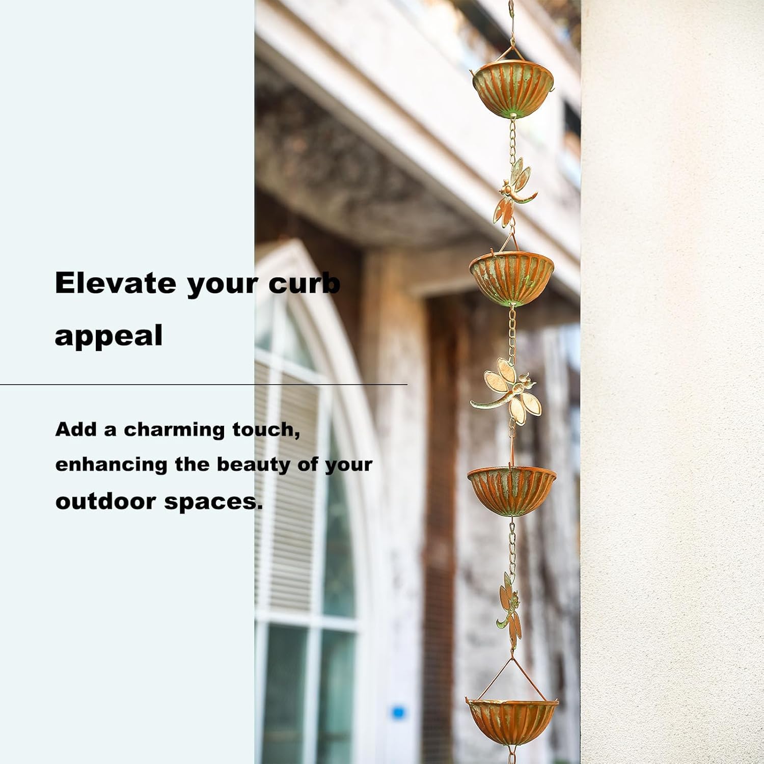 - Efficient Rainwater Management: This 8.5 feet length rain chain includes a hanger and features 9 wide bowl mouths to efficiently capture most of the rainwater, with 8 cute dragonflies attached to the chain