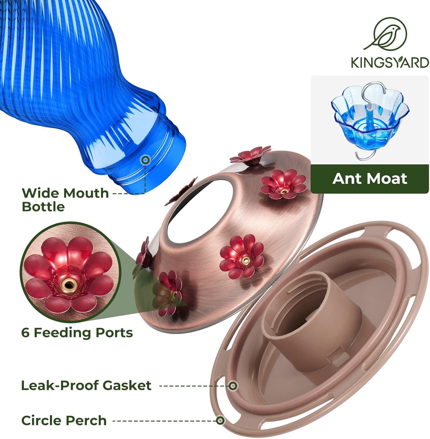 - Bee-Guard Ports & Ant Moat: The feeding ports are precisely sized for hummingbirds, creating an exclusive dining spot that helps keep bees out of the nectar. Additionally, the feeder includes an ant moat to deter ants