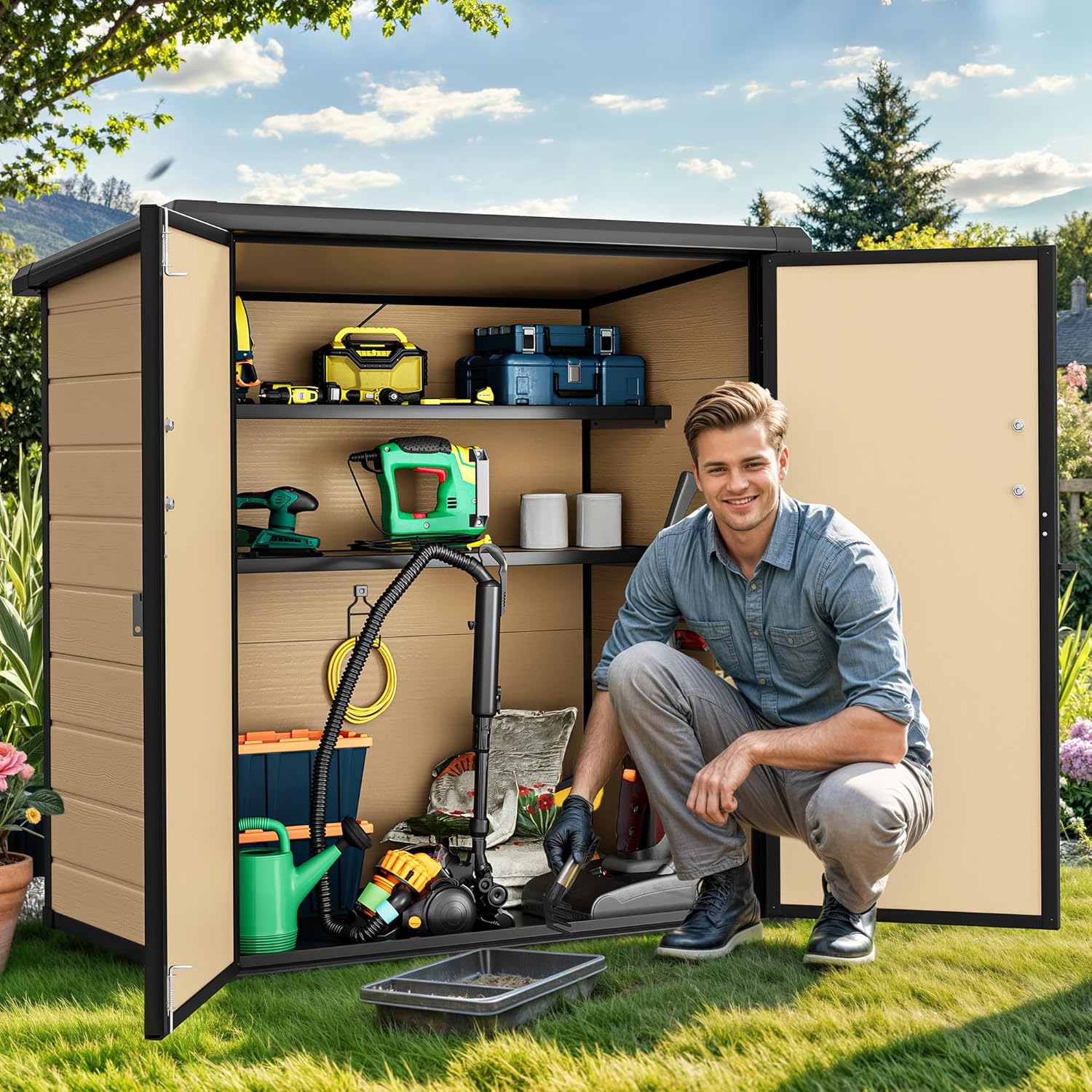 - Ideal Weather-Resistant Storage: Crafted from durable 12mm double-layer PP walls, this outdoor shed withstands sun, rain, and snow, keeping your tools, garbage cans, and garden accessories safe and dry all year round