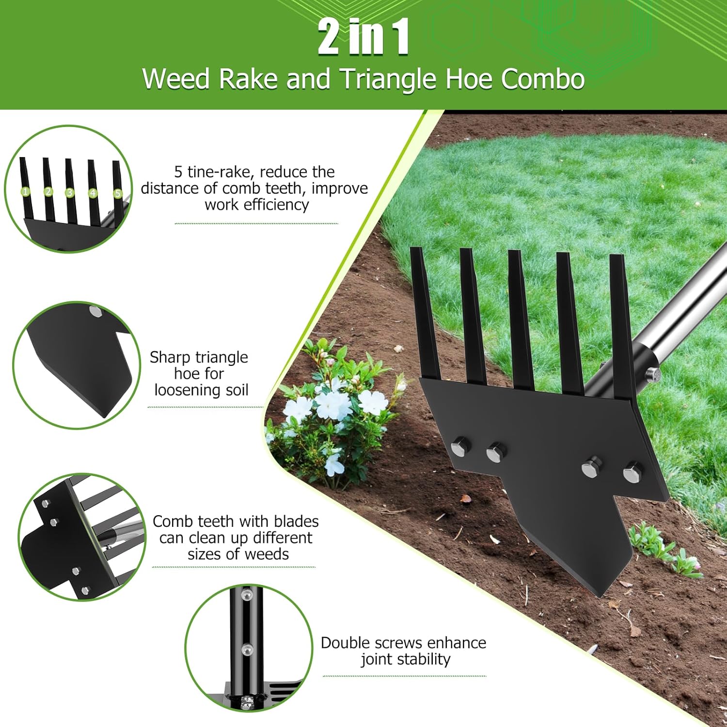 - 2-IN-1 GARDEN HOES: This hoe garden tool has a unique double-head design. One end is a sharp triangular head, which is used for digging, breaking up soil, and cutting through the roots of stubborn weeds. The other end is a five - toothed weed rake with a blade, suitable for removing weeds and roots of different sizes or leveling the land, making your gardening work easier and more efficient.