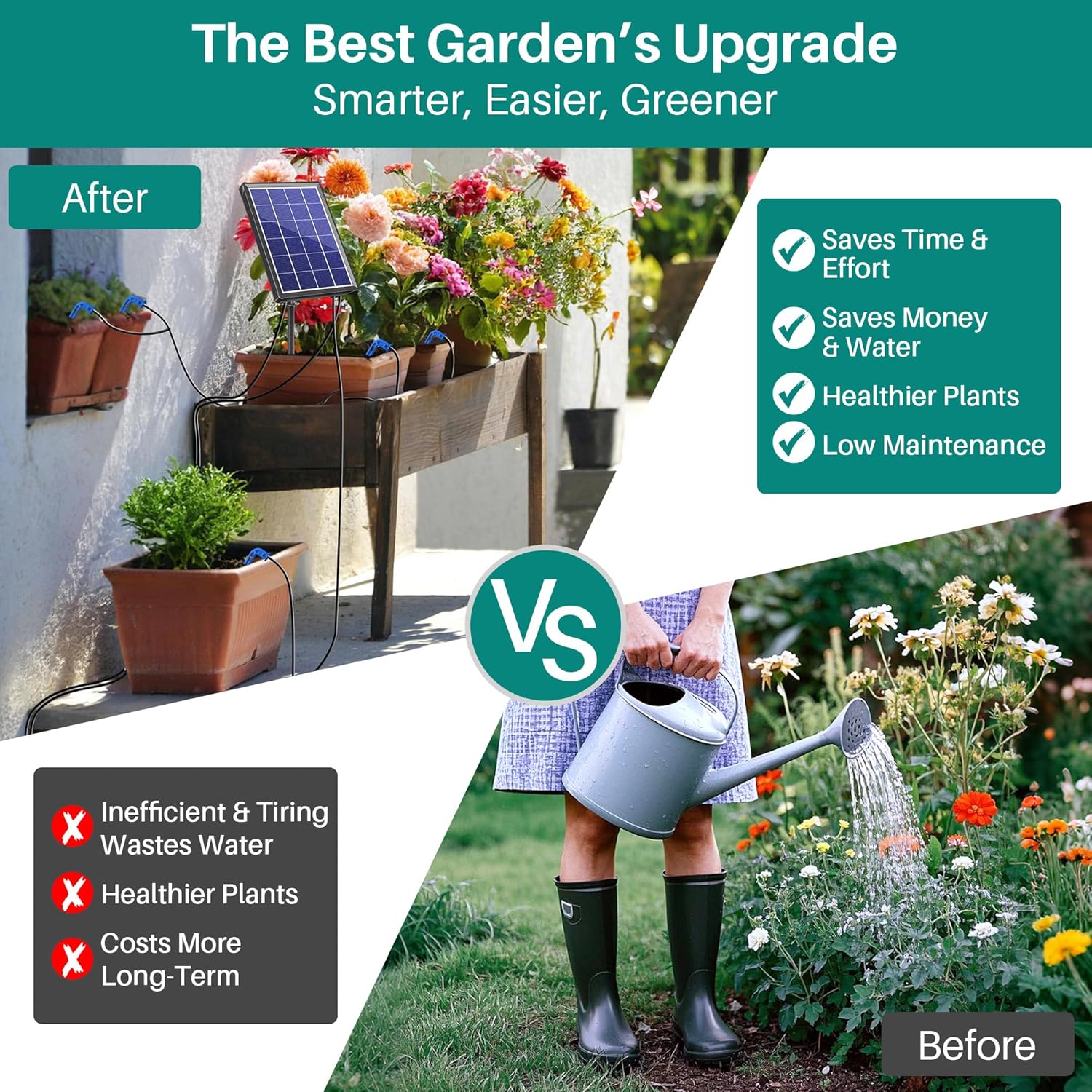 - Solar-Powered & Battery Backup: The smart solar drip irrigation system with built-in 2200mAh battery automatically switches between solar and battery power, ensuring reliable watering day and night - no electrical outlets needed! Perfect for remote garden beds, balconies, and eco-conscious gardeners looking to reduce their carbon footprint