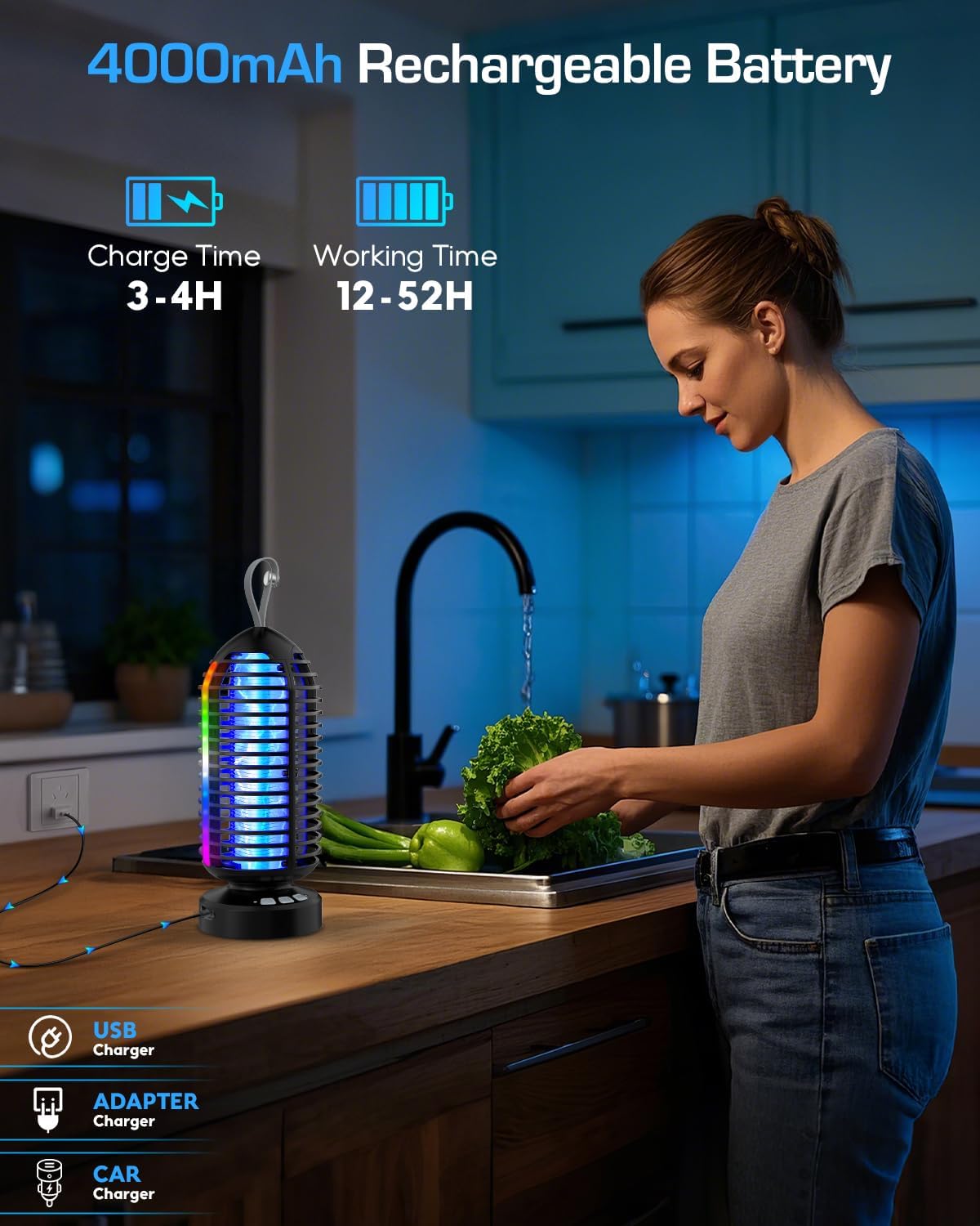 - Rechargeable 4000mAh Battery: This indoor fly zapper features a high-capacity 4000mAh battery, offering extended runtime: 12–16 hours in mosquito light mode, 7–18 hours in night light mode, and 17–52 hours in ambient light mode.With quick USB-C charging, it takes just 3-4 hours to fully recharge. Enjoy the freedom of cordless operation—whether at home or on the go, its portable, cordless design ensures continuous mosquito protection, letting you sleep peacefully without interruption.