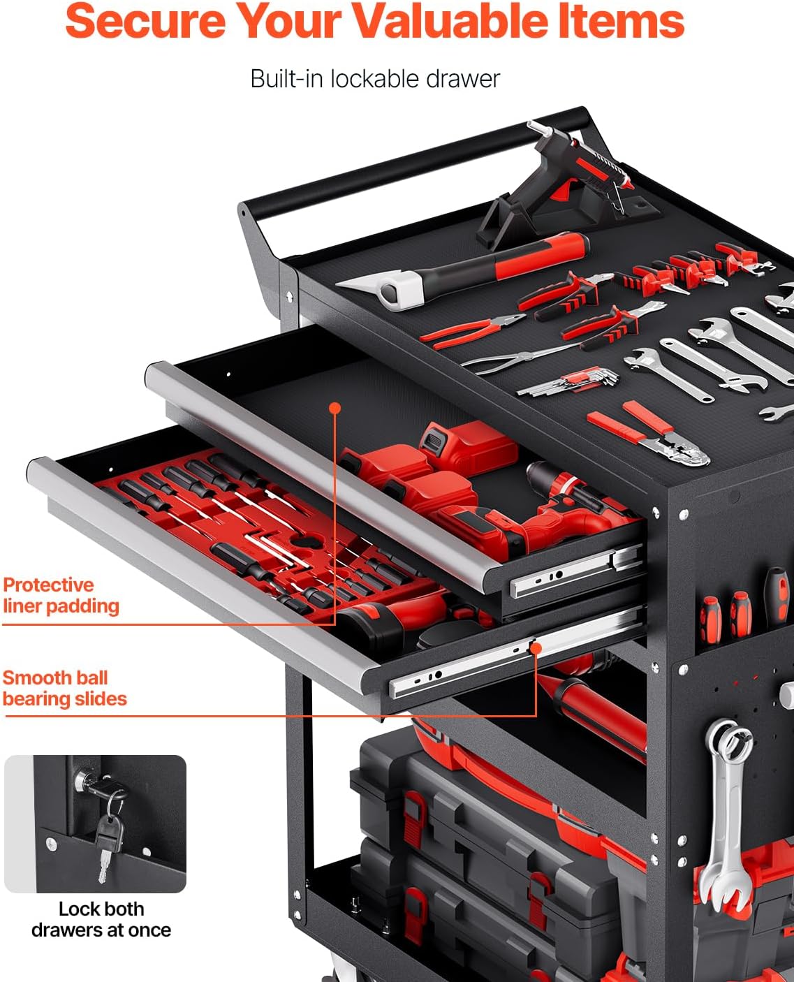- Lockable Drawer: The drawers of our metal tool cart slide smoothly with ball bearings and lock for security. EVA padding in the drawer and top tray avoid scratches, ideal for securing delicate tools.