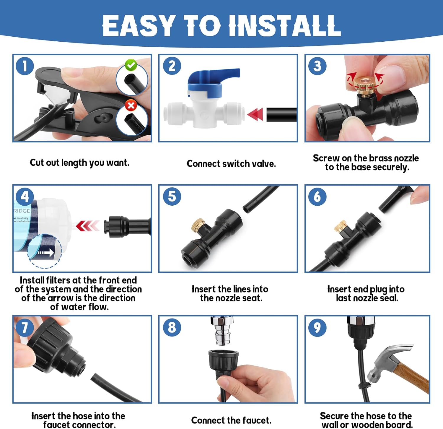 - 【Patio Misters with Dual Water Filtration】Kalolary misting cooling system features a built-in faucet filter screen and an additional tube water filter to prevent debris and particles from clogging the system, reducing leaks and improving water quality. Enjoy a consistent, high-performance mist with smooth water flow for a refreshing outdoor experience.