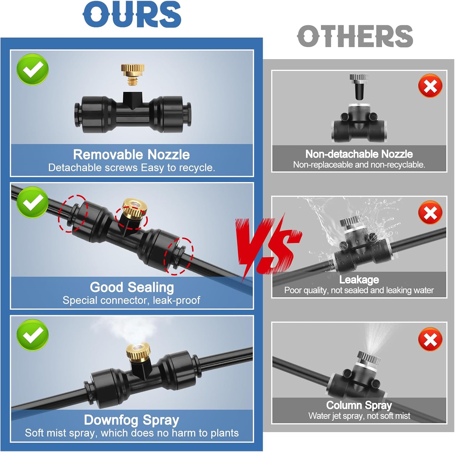 - 【Efficient Outdoor Cooling Misting System】Stay cool outdoors all summer long with Kalolary misters for outside patio! With a 100FT misting line, 30pcs upgraded T-shape atomizing adapters, 30pcs brass misting nozzles and all accessories you need, this system provides a leak-free, fine mist cooling effect that can lower temperatures by up to 23°C (73°F). Perfect for hot summer days, enjoy the refreshing outdoor cooling experience with minimal water usage.
