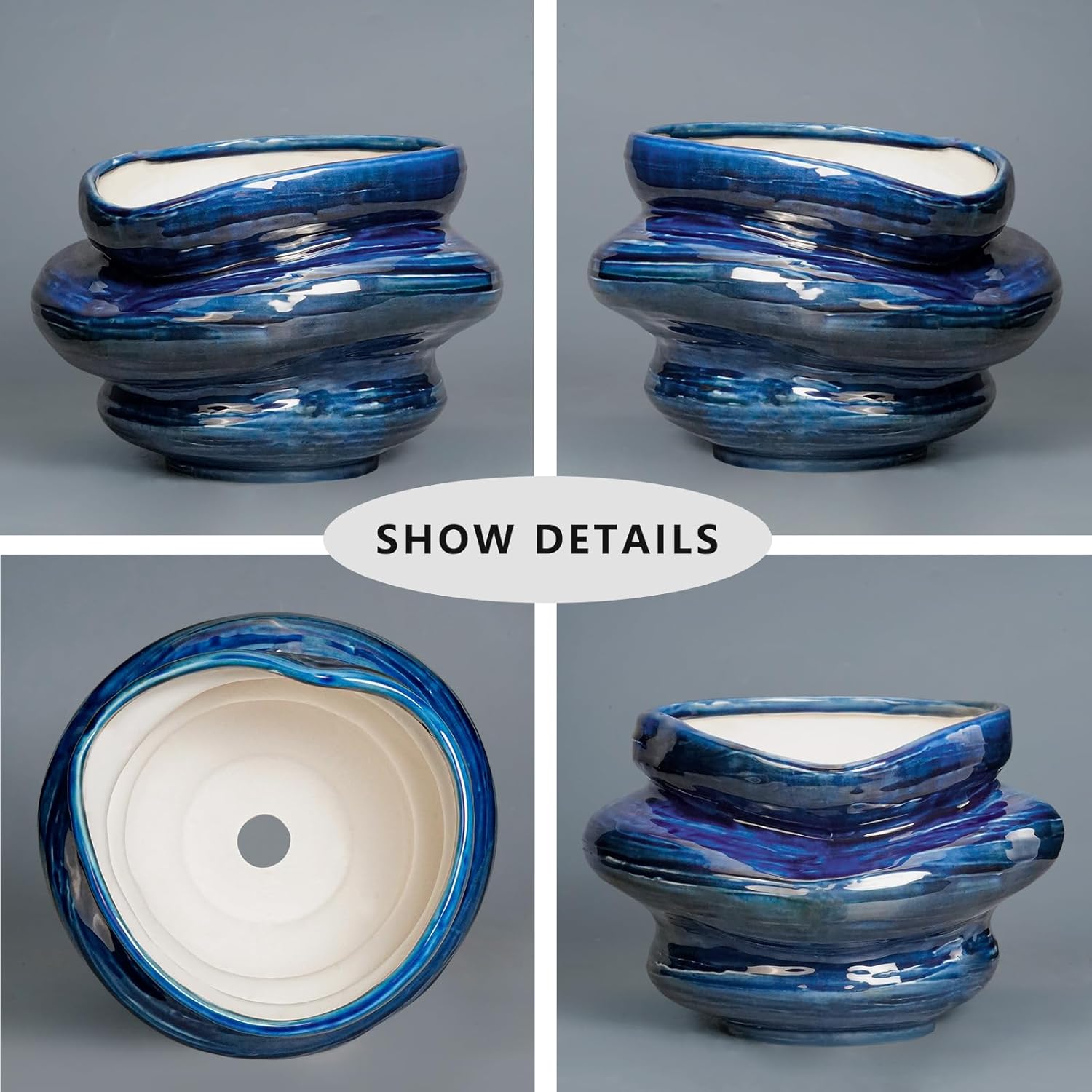 Ceramic Pots for Plants - 11 Inch Ceramic Planter with Drainage Hole, Decorative Planters for Indoor Outdoor, Unique Flower Pots, Garden Office House Decor, Birthday Housewarming Gifts, Blue