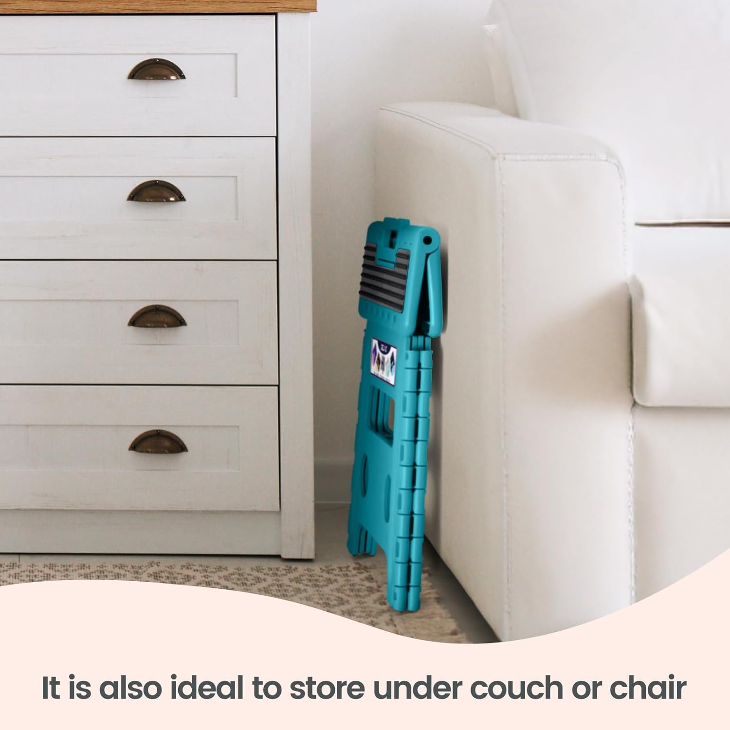 - Space Saving Foldable Stool: Delxo 13 inch step stool save your closet space more than 90% when it folded up. It's quickly and easily folds away for convenient storage so that you can open with one flip of the hand. Also you can hides them in corner at home because it's so compact
