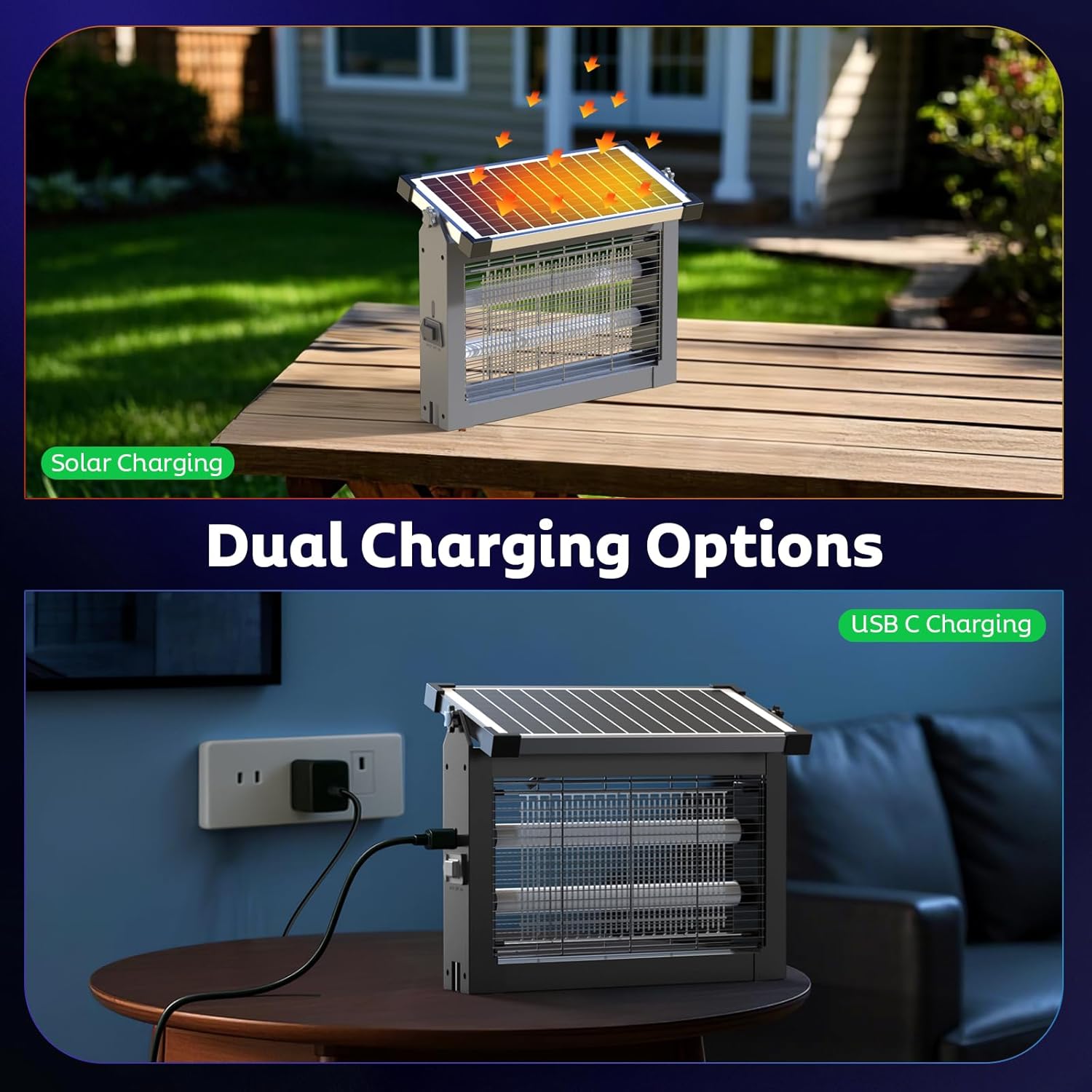 - Dual Charging Options: Solar & USB Powered: This solar powered mosquito zapper features a 10W 5V monocrystalline solar panel and a 4,000mAh rechargeable battery for eco-friendly, energy-efficient operation. Charge it with direct sunlight for sustainable use, or quickly recharge via USB using the included 4ft USB-C cable in just 3-4 hours. Enjoy up to 12 hours of continuous protection on a full charge. Ideal for both indoor and outdoor use, whether at home, in an RV, camping, or in your backyard