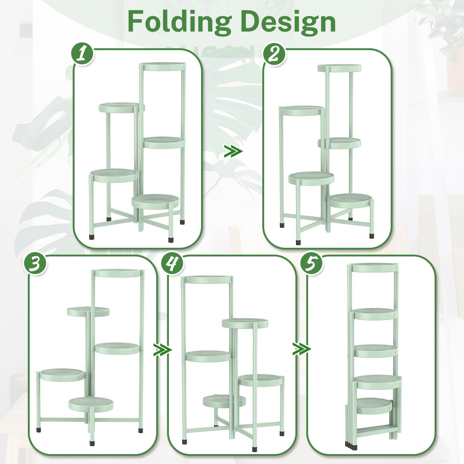 iDavosic.ly Plant Stand Indoor Outdoor, 5 Tier Corner Metal Flower Display Holder Shelf, Folding Tall Orchid Rack for Patio Balcony Porch Garden Living Room House, Light Green