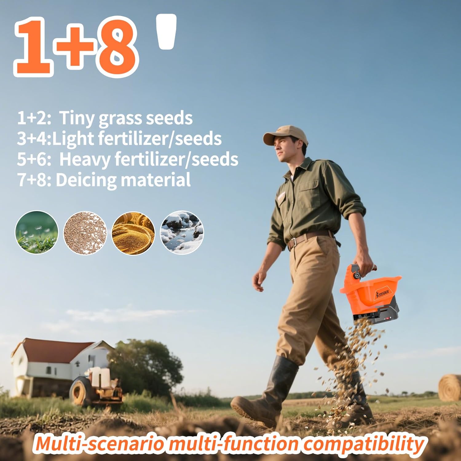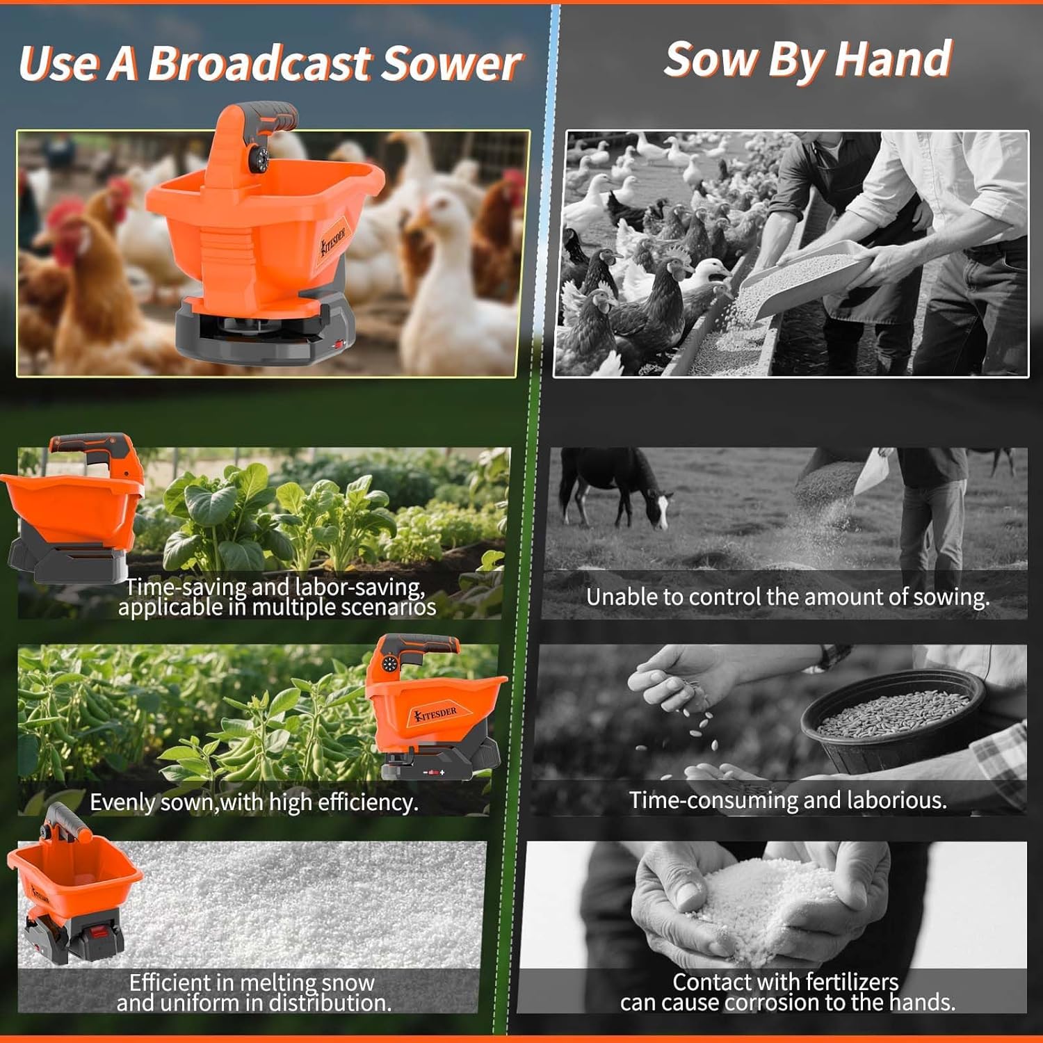 - 【Four-Season Utility】Greatly improves work efficiency by being usable year-round, whether sowing seeds in spring, spreading fertilizer in summer, sprinkling salt in winter, or feeding animals as needed.
