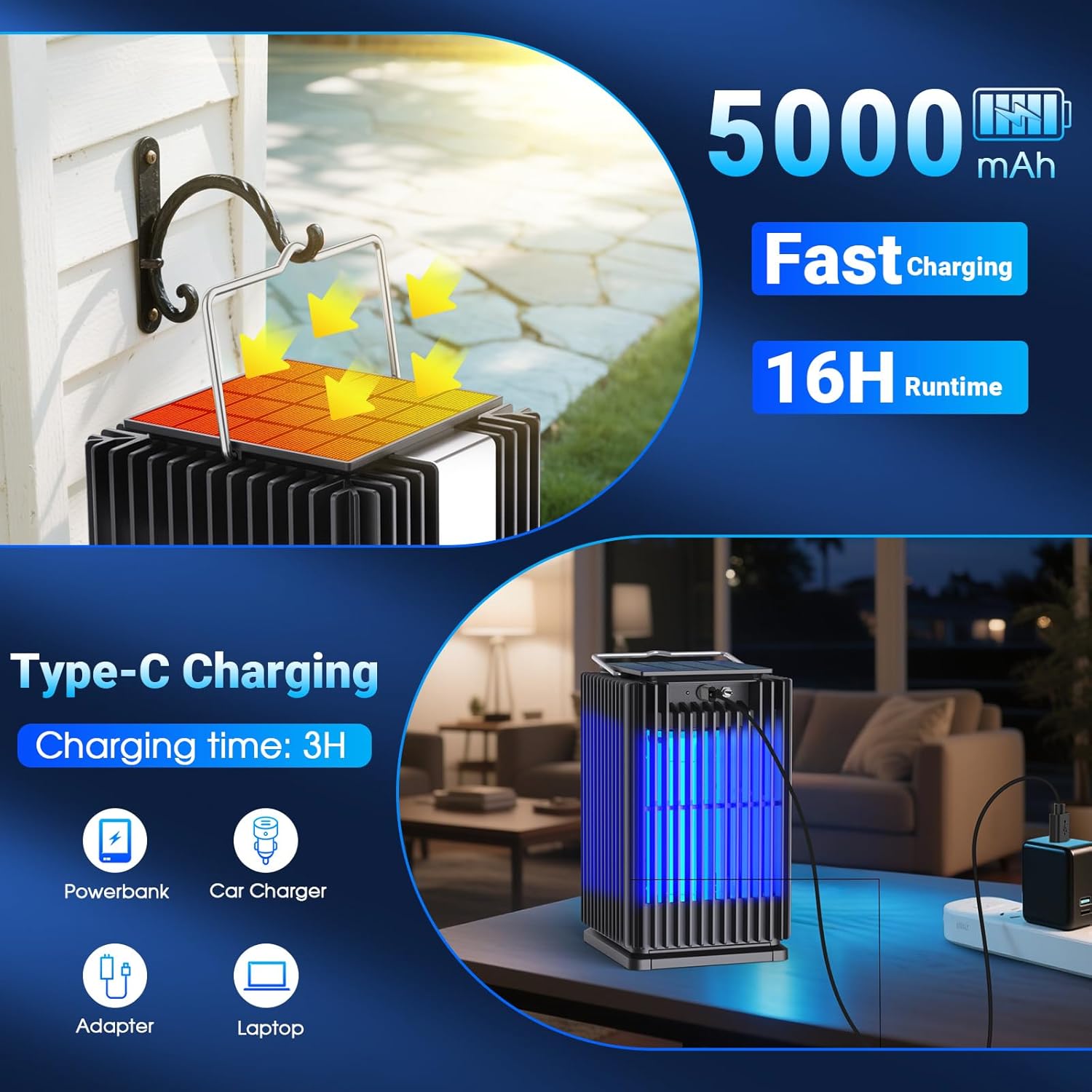 - Solar Powered and Rechargeable Bug Zapper: Solar bug zapper with 5000mAh battery, charge the outdoor bug zapper effortlessly during the day with built-in solar panels, a fast Type-C charge gets it fully powered in 2–3 hours for up to 16 hours of use.