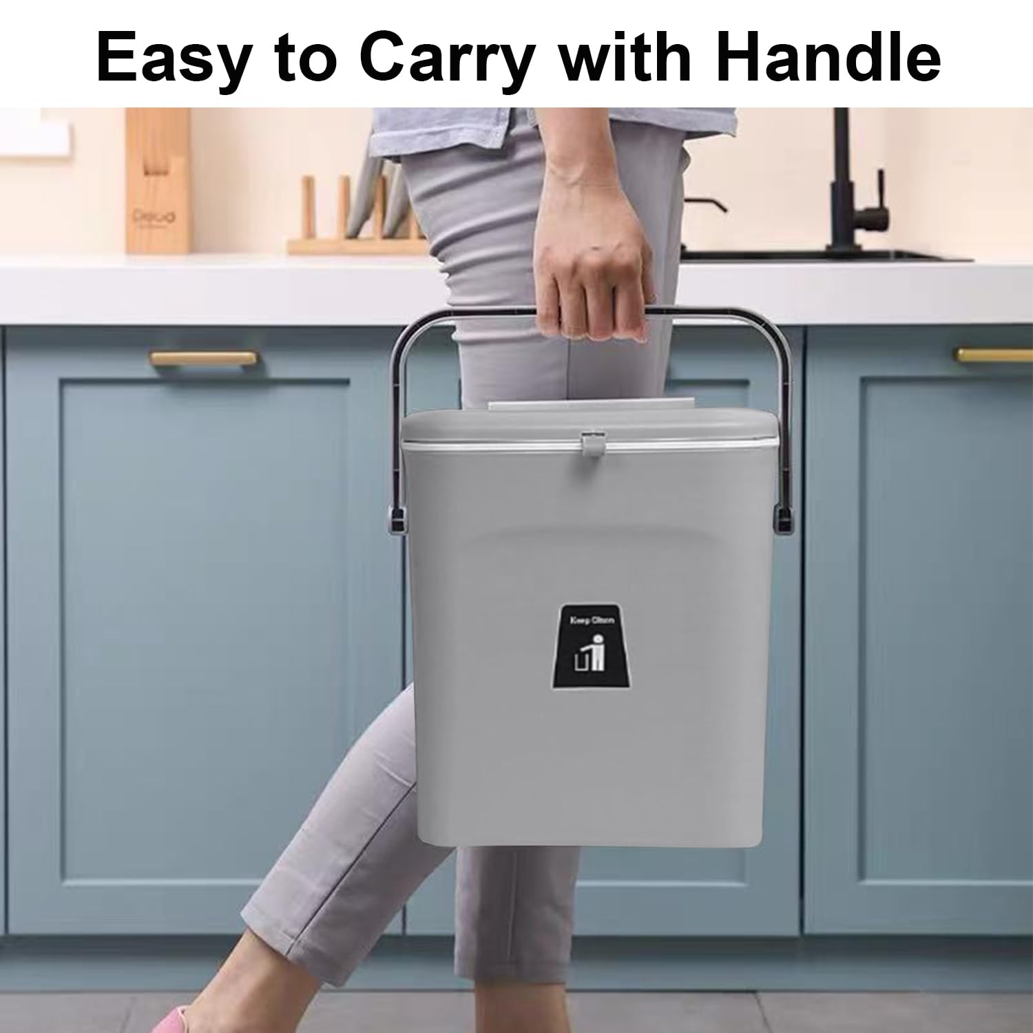 - Wall Mount/Under Sink/Countertop Trash Can: The small trash can with lid can be easily hung on kitchen cabinet doors, pantry doors. (The thickness of the door should be less than 0.86 inch) Moreover, this food waste caddy can also be wall-mounted to under sinks, cupboard, kitchen wall or bathroom wall with adhesive pad .