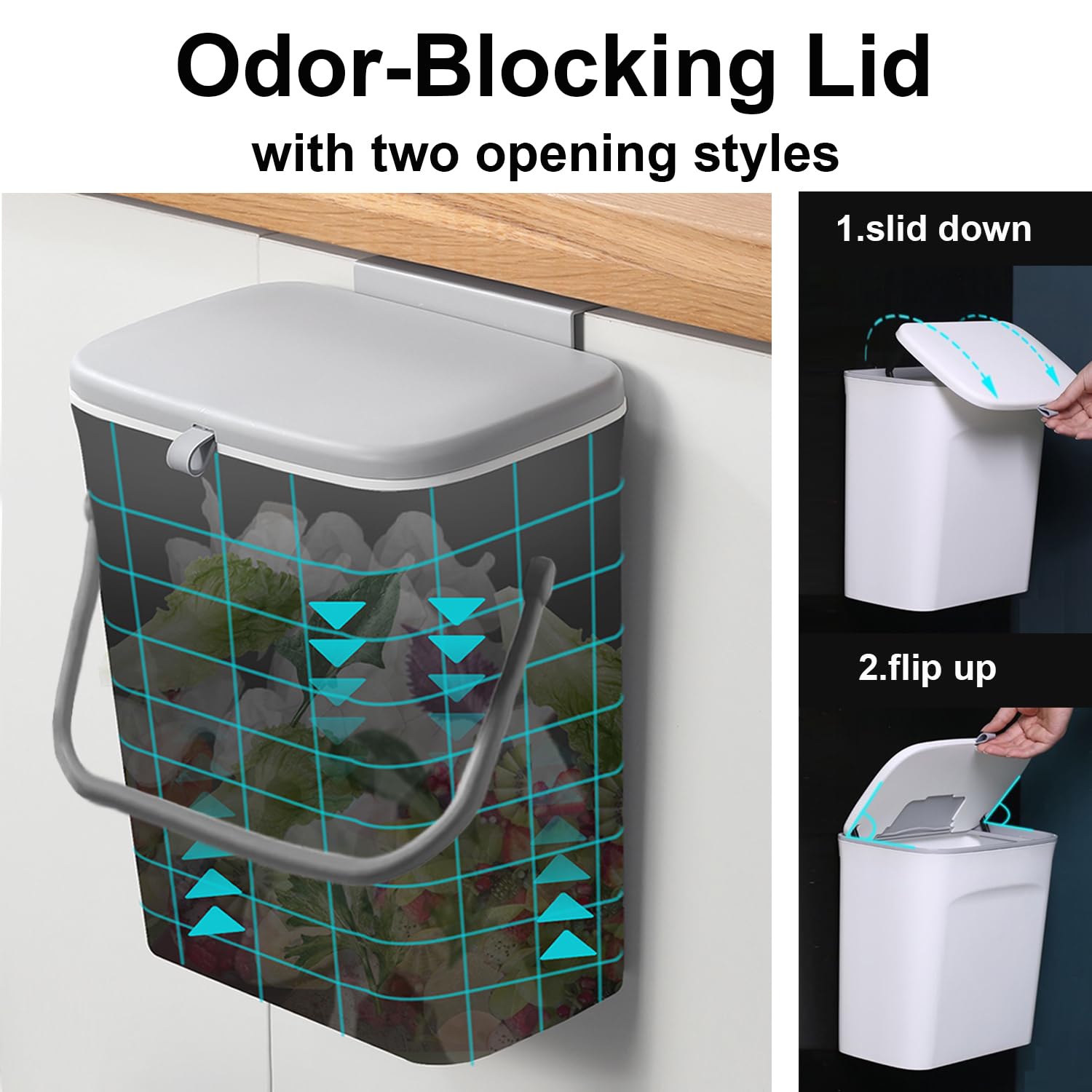 LALASTAR Kitchen Compost Bin for Countertop or Under Sink, Hanging Small Trash Can with Lid for RV/Office/Bedroom/Dorm, Mountable Indoor Compost Bucket, 9L/2.4 Gal, Grey