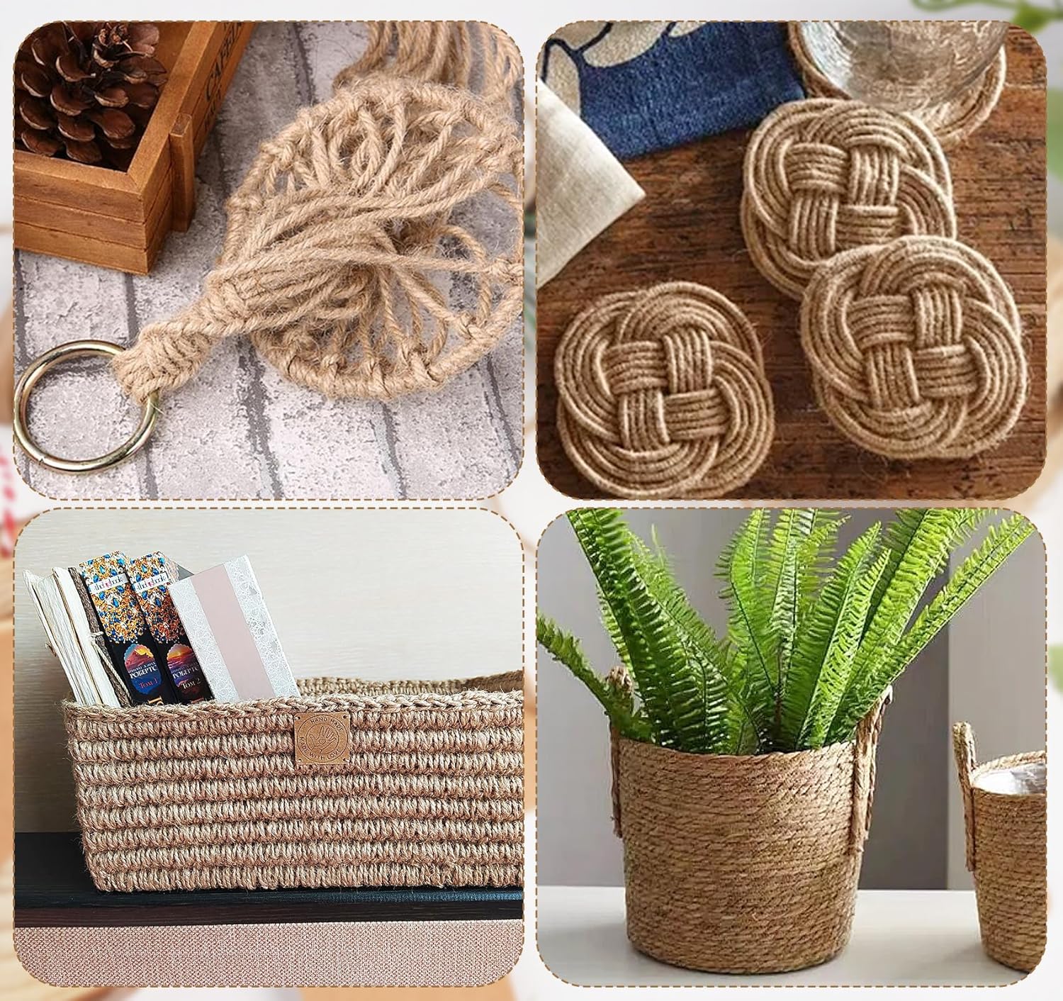 - Natural Jute - Made from pure natural jute fibres, garden twine twisted from four strands of jute fibres, suitable for craft projects, packaging materials, gardening applications, weaving plant hangers, repairing cat scratchers, or home decor, creating handmade rustic-style decor.