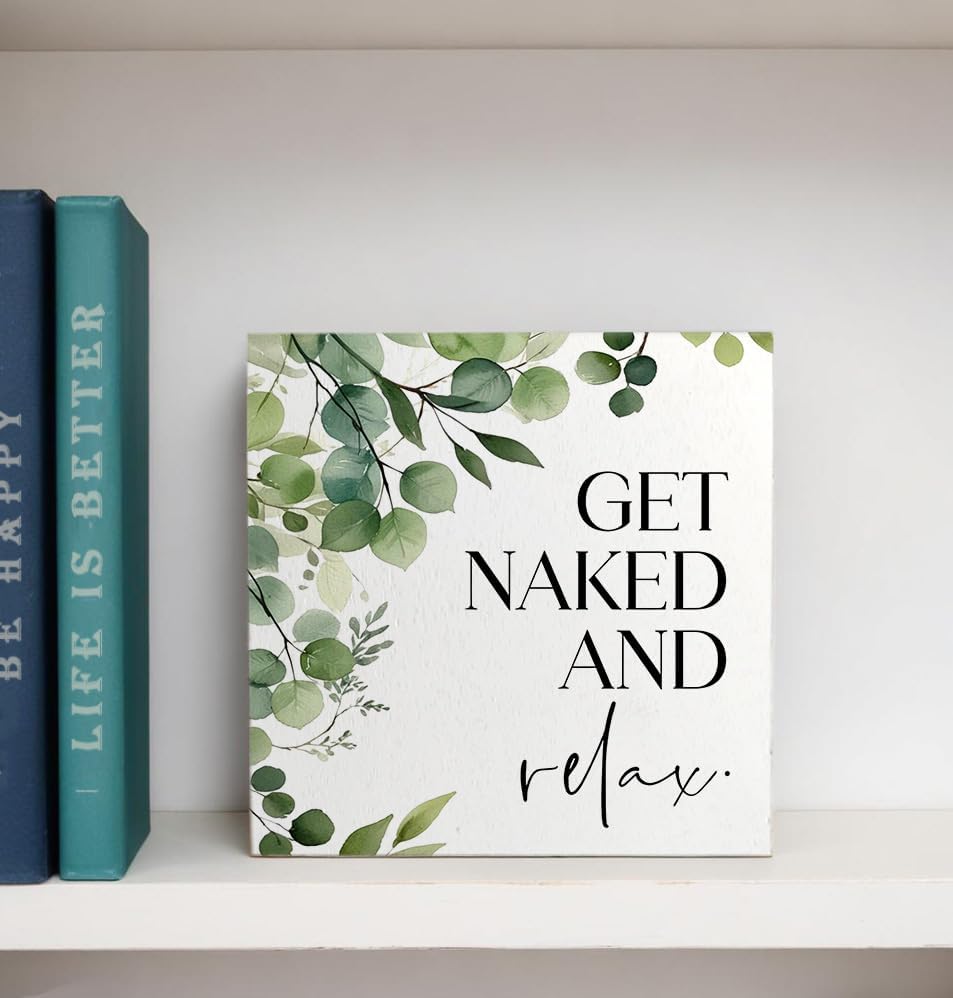 Get Naked And Relax Funny Bathroom Wooden Box Sign, Eucalyptus Botanical Wood Signs for Restroom Bathroom Toilet Half Bath Shelf Counter Decor, 5x5 Inch