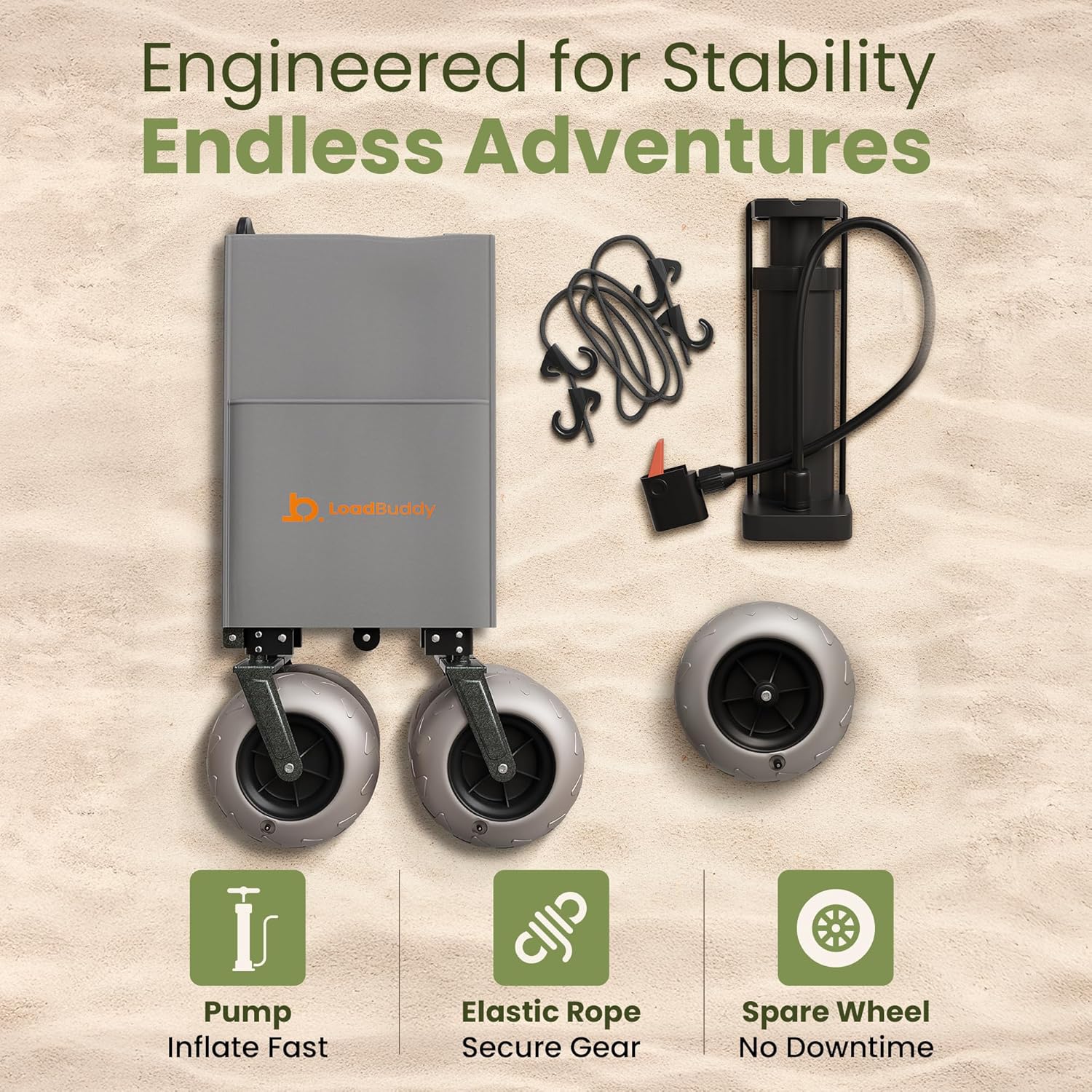 - STAY READY FOR ANY TERRAIN – Glide over sand, grass, and gravel with this foldable wagon for beach. Inflatable wheels distribute weight evenly and absorb bumps, keeping your groceries, garden tools, and sports gear safe during transport.