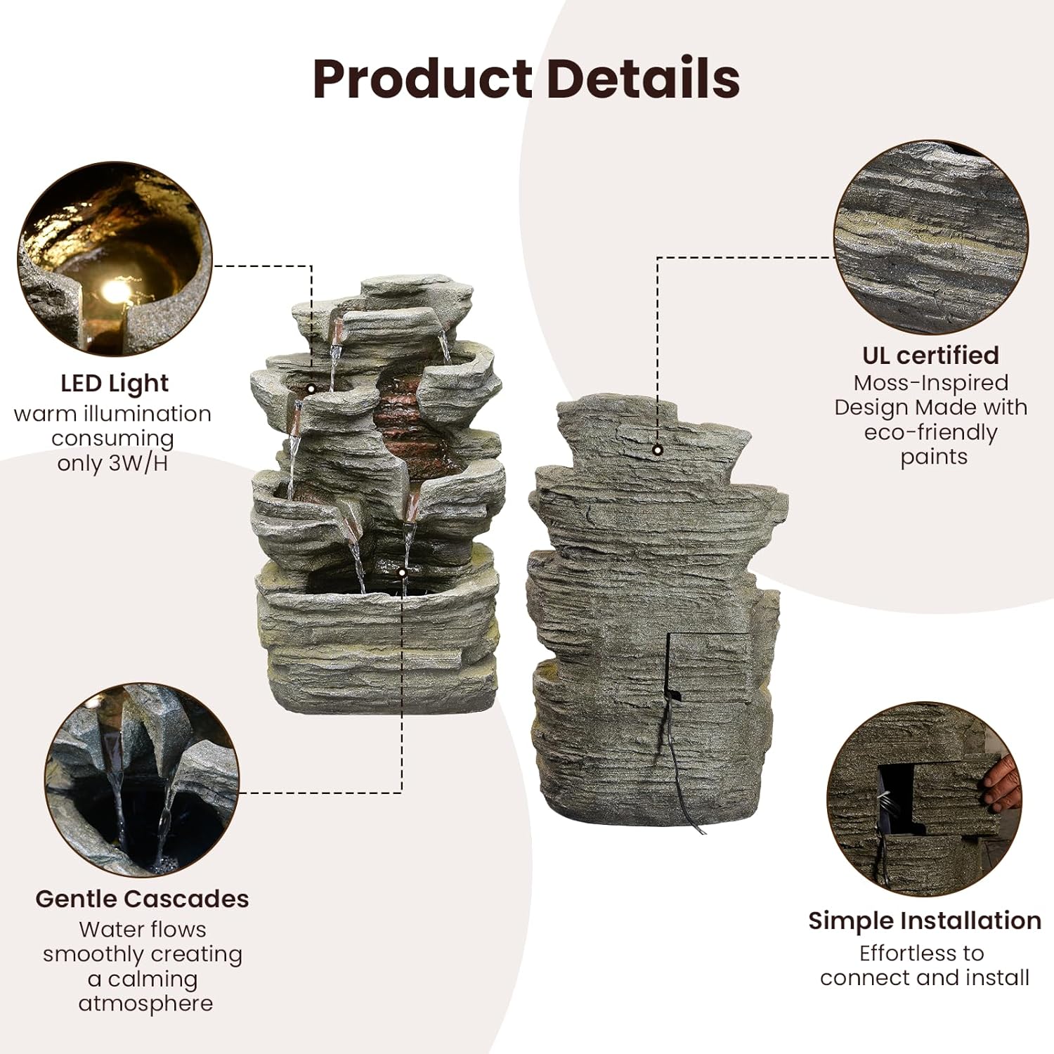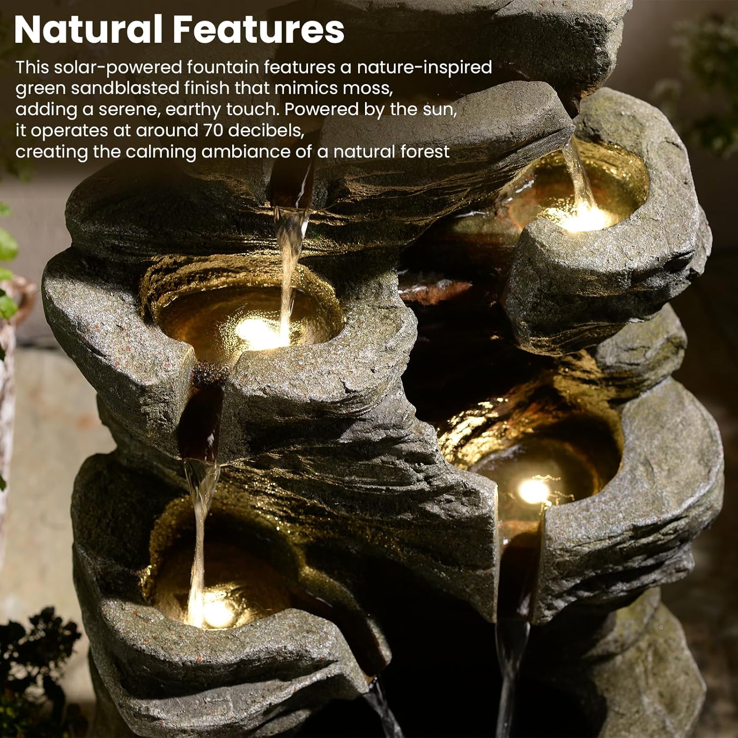 6-Tier Solar Water Fountain Outdoor, 24.4" H Cascading Rock Feature Garden Fountains and Waterfalls with Light, Pump, Solar Panel for The Patio, Deck, Porch, Backyard Home Décor, Stone Gray