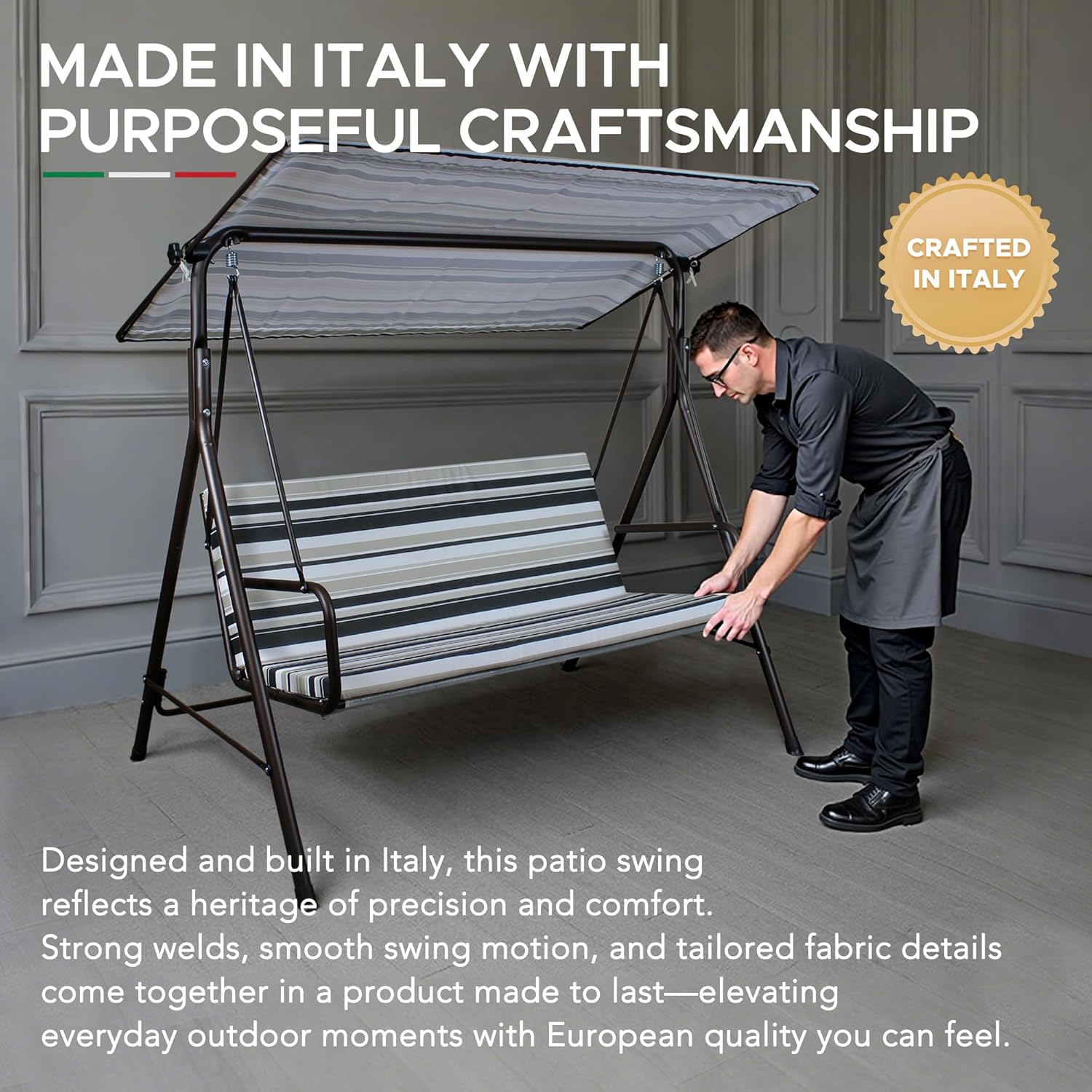 - ăMade in Italy with Purposeful Craftsmanshipă- Designed and built in Italy, this patio swing reflects a heritage of precision and comfort. Strong welds, smooth swing motion, and tailored fabric details come together in a product made to lastâelevating everyday outdoor moments with European quality you can feel.