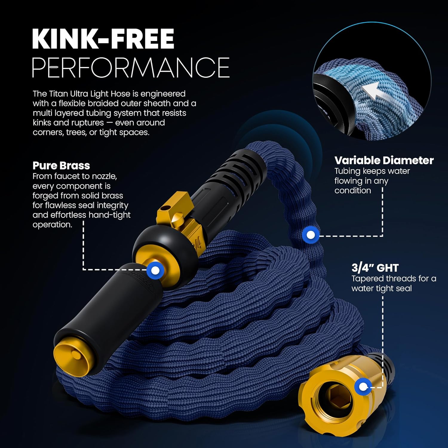 - [Feather-Light, Super Strong] Redefining watering with its incredibly lightweight design, experience unmatched watering efficiency with our Titan garden hose. When paired with our precision-engineered nozzle, this hose delivers exceptional pressure for everyday watering tasks while saving you water. Ideal for garden maintenance, vehicle cleaning, RV, marine use and more, for a powerful and consistent water flow.