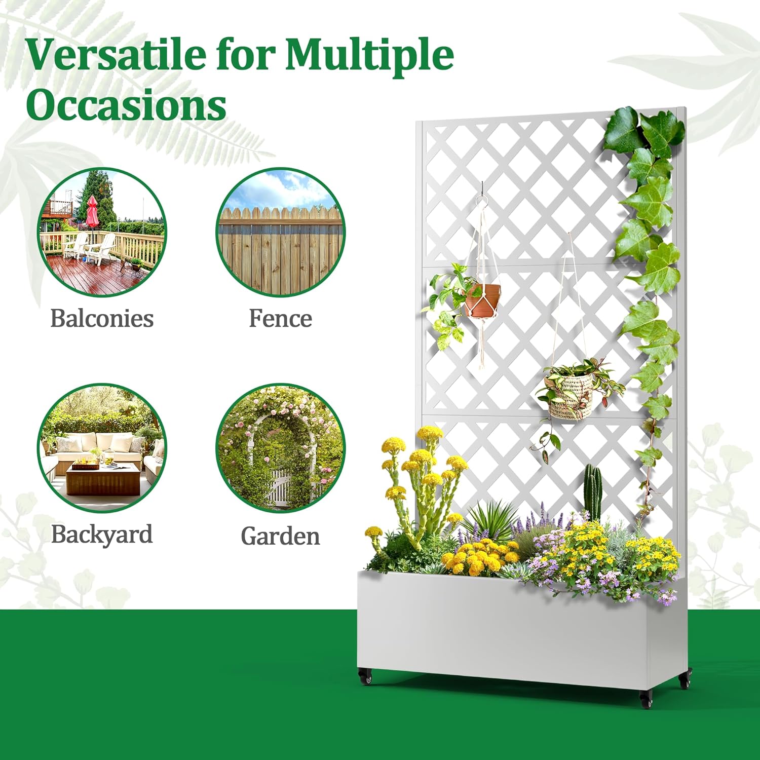 - Space-Saving Design: The planter box is combined with the trellis to provide a space-saving and aesthetically pleasing gardening solution. The vertical design of the trellis maximizes the planting area while maintaining a compact footprint. The outdoor raised garden bed’s vertical design is ideal for people with limited space to build a beautiful garden on a terrace or in a small yard.