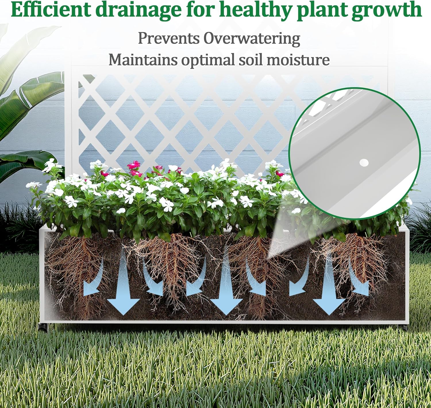 - Optimal Water Management: The planter with trellis is designed with a certain depth planting bed, providing ample space for root growth. The raised garden bed also includes built-in drainage holes that effectively prevent waterlogging, ensuring your plants receive the right amount of moisture for healthy development.