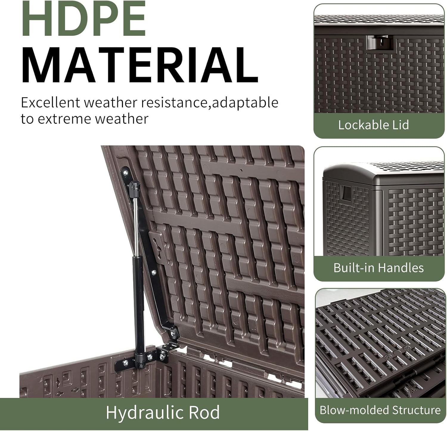 - HDPE Material:Create a tidy, cozy home while doing our part for a greener Earth! Our entire line of outdoor storage boxes is made from eco-friendly, recyclable HDPE, which is non-toxic and safe. Compared to PP material, HDPE offers superior durability, weather resistance, and waterproof performance—protecting your belongings year after year