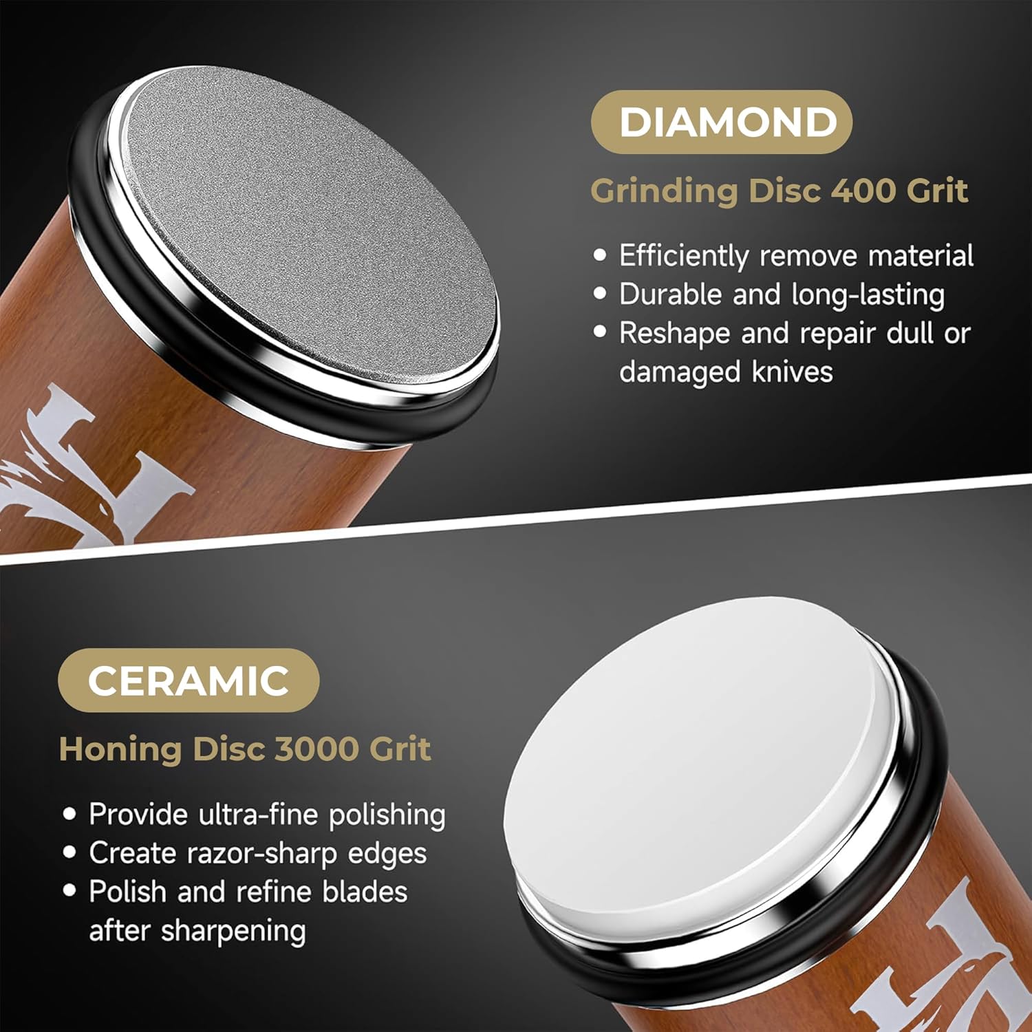 - ✅ Pro Results – No Skill Needed – Whether you're a beginner or a seasoned chef, achieve razor-sharp edges in seconds. The intuitive design, easy-to-swap discs, and dry sharpening system make blade maintenance simple and mess-free.