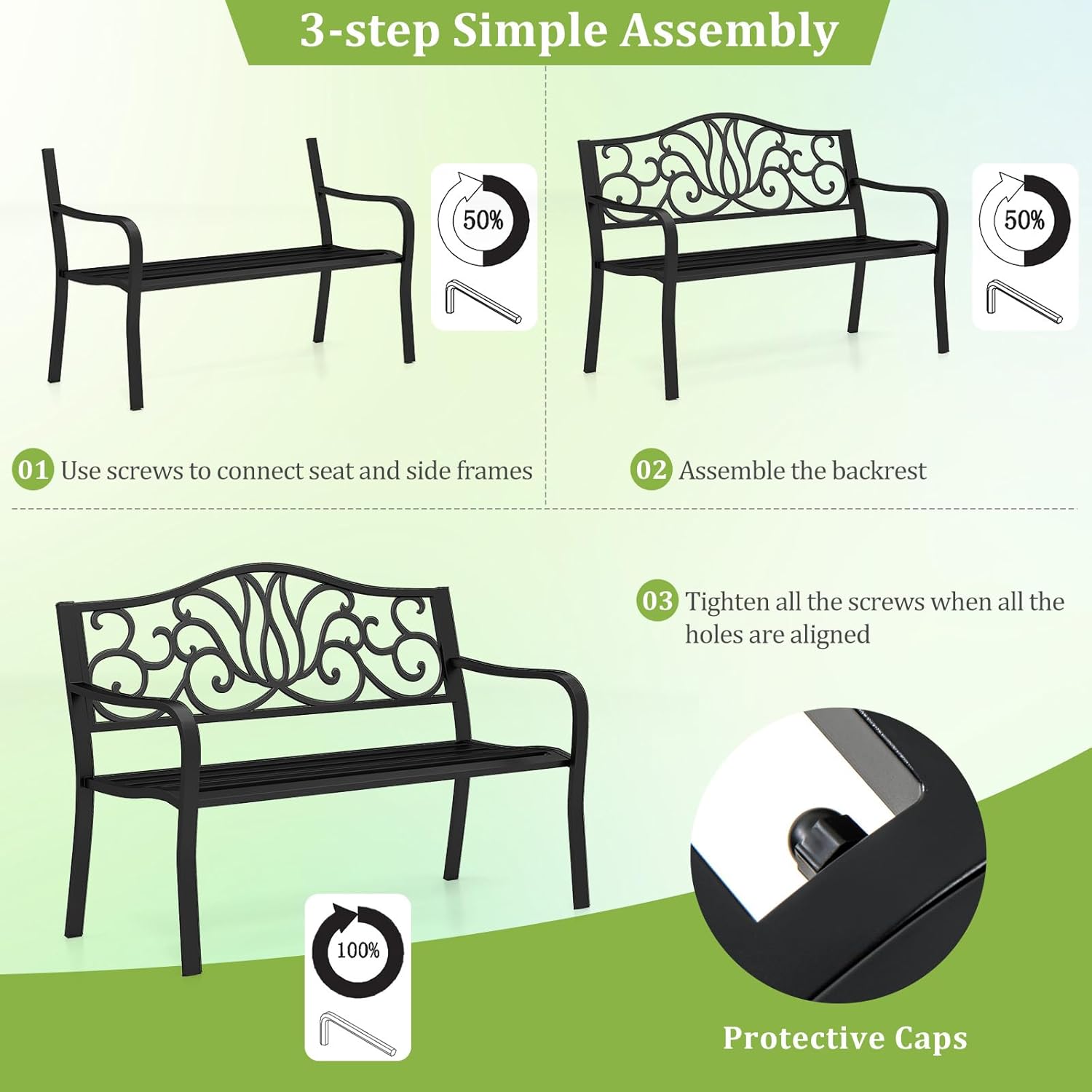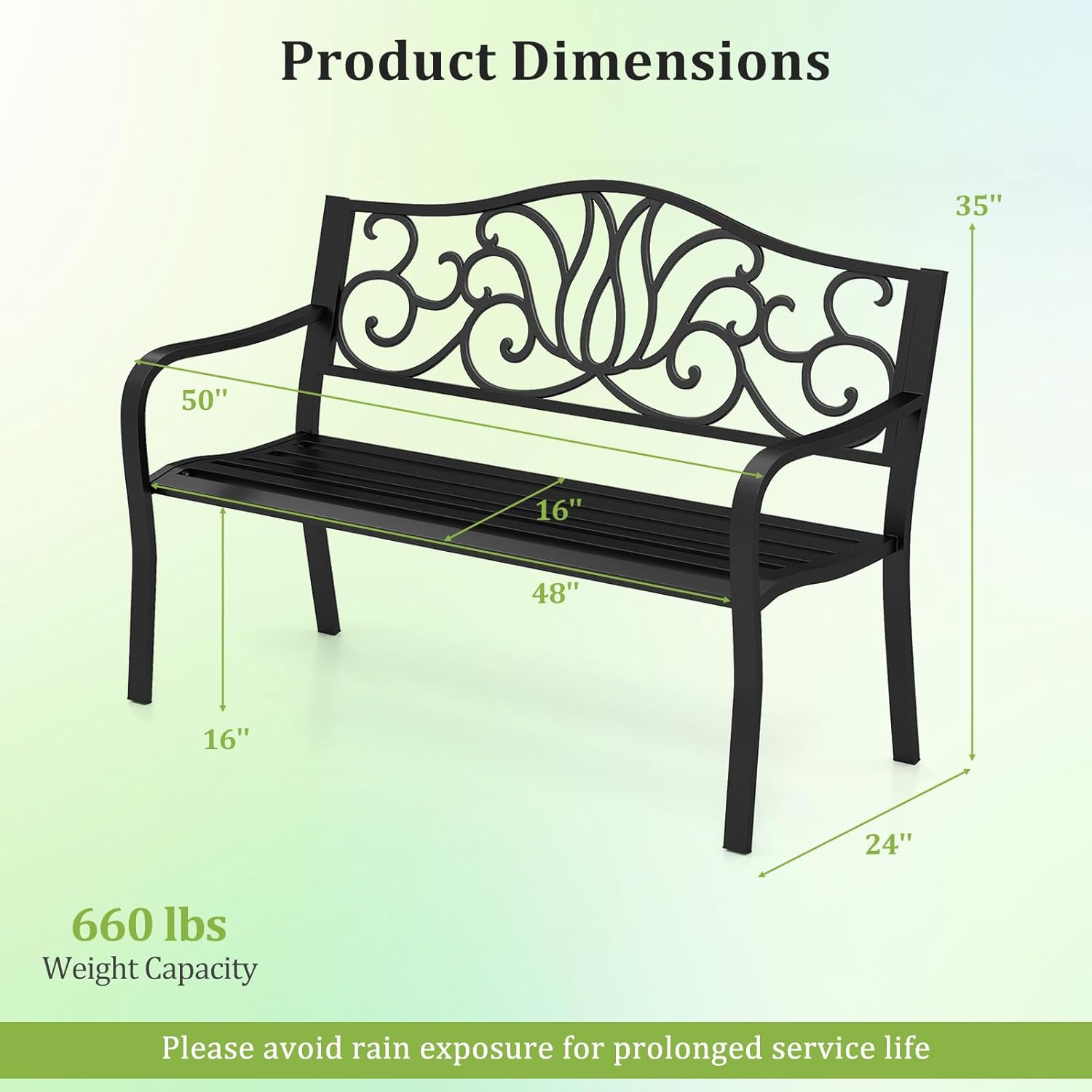 Tangkula 50 Inches Outdoor Garden Park Bench, Cast Iron Metal Front Porch Loveseat with Floral Design Backrest and Slatted Seat, Patio Bench with Armrests for Outside, Yard and Lawn, Black