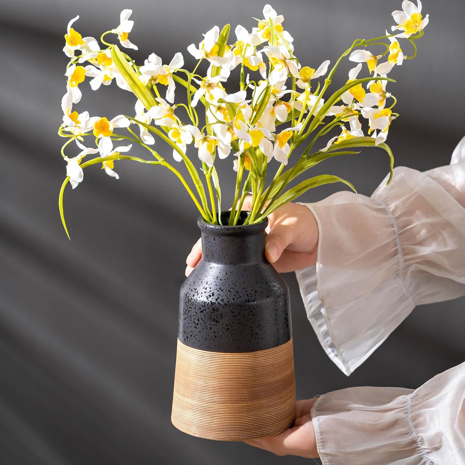 - 【Two-Tone Striped Design & Rustic Modern Farmhouse Style】Handcrafted ceramic vase combines bold black and warm brown horizontal stripes for a striking rustic-modern aesthetic. Perfect as mantle decorations, living room centerpieces, or cottage core decor accents. The 7.7" height and 2.55" wide opening balance floral arrangements and dried botanicals like pampas grass, eucalyptus, or wedding bouquets.