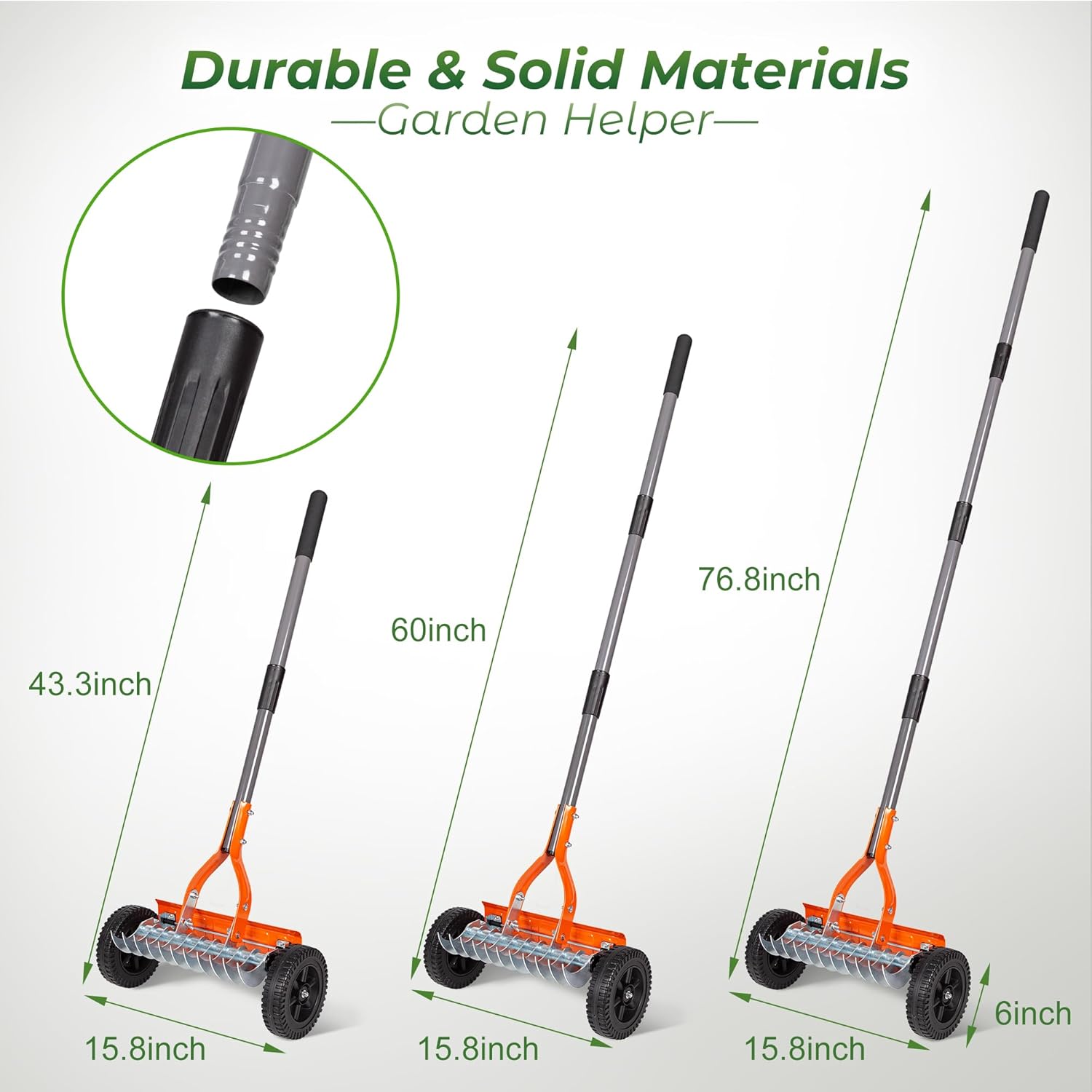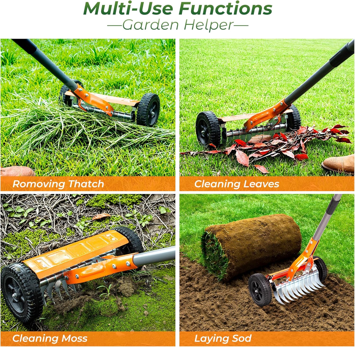 - Labor-Saving Dethatcher Rake with Wheels:Unlike traditional manual dethatchers, this rolling thatch rake is equipped with sturdy wheels to reduce resistance and make it easier to push across your lawn.The anti-loosening wheel nuts keep the wheels securely in place, allowing for a smoother, more efficient lawn dethatching experience. Ideal for anyone looking for a reliable manual dethatcher that’s easy to use on various terrain types.