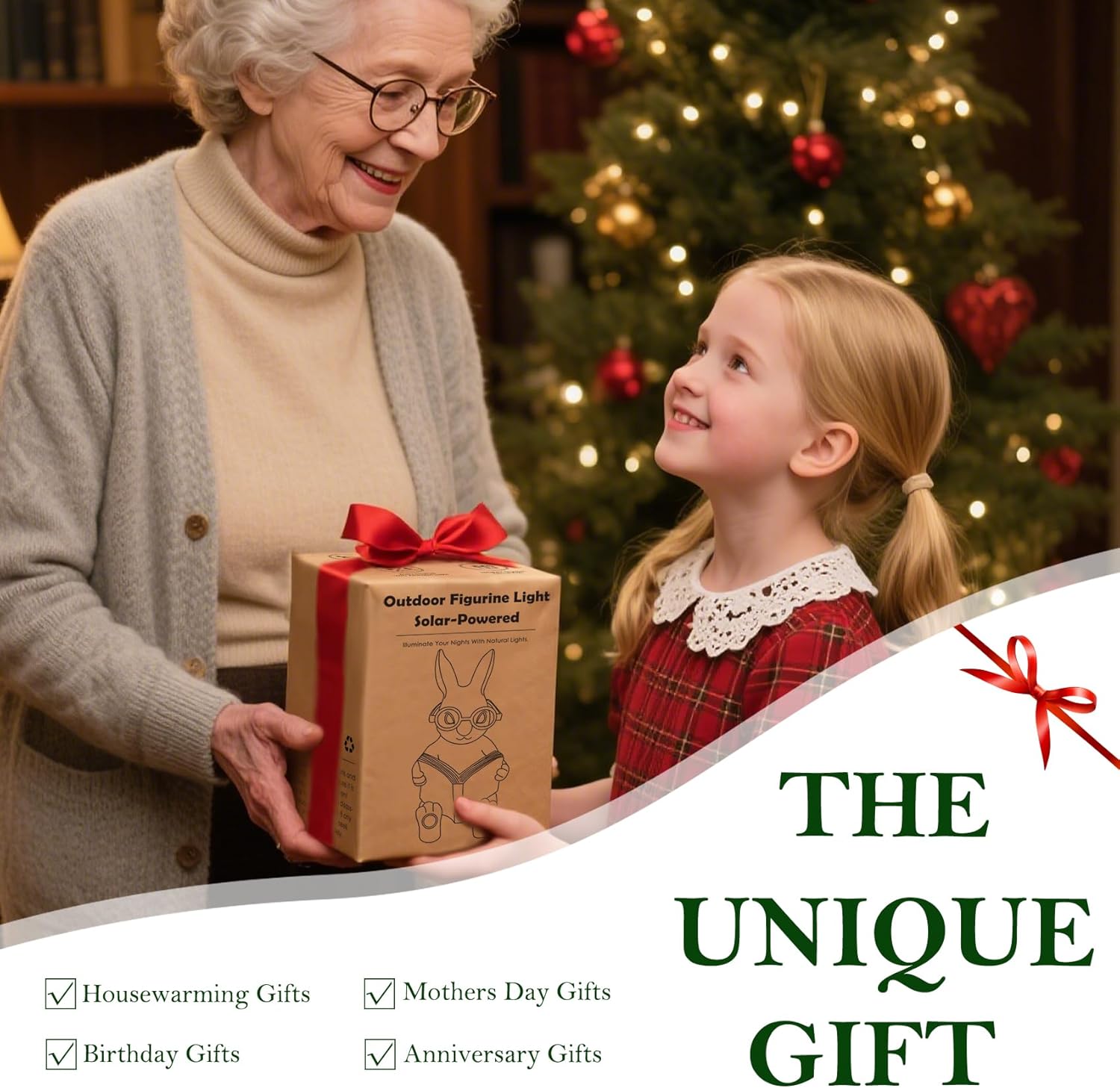 - Whimsical & Adorable Design: Meet your favorite garden companion! A sweet rabbit sits thoughtfully, cradling an open book and adorned with yellow solar-powered glasses. As dusk falls, the glasses emit a soft, warm glow, creating a magical garden ambiance
