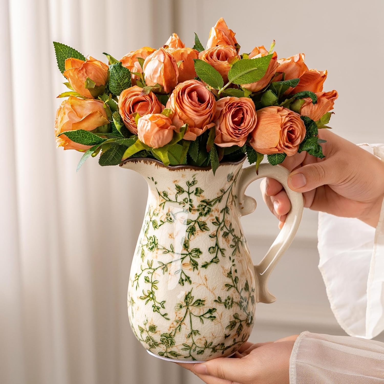 Ceramic Vases Set of 3, Green & Beige Chinoiserie Flower Pitcher Vase, Farmhouse Vintage Floral Vase Home Decor for Mantle, Fireplace, Kitchen Counter, Living Room Bookshelf Rustic Table Centerpiece