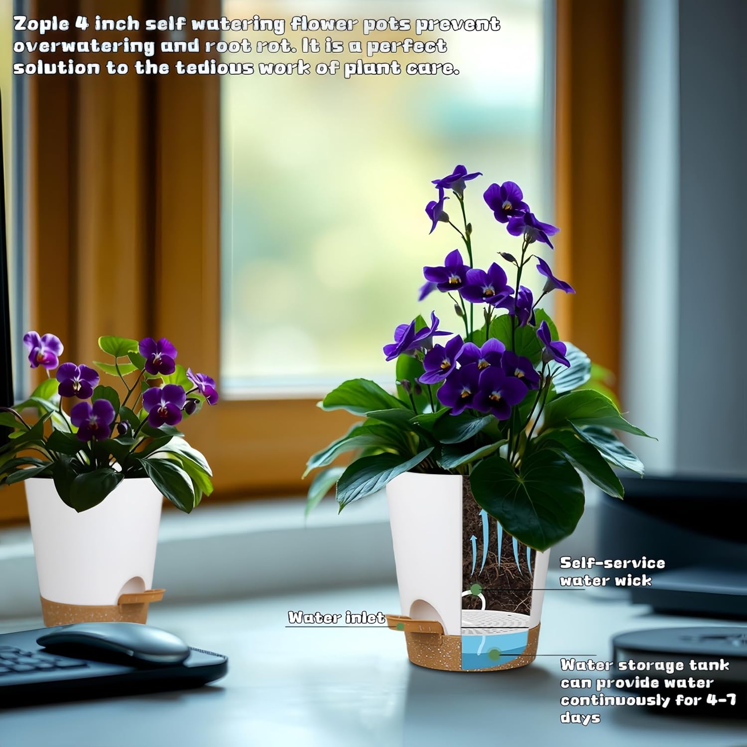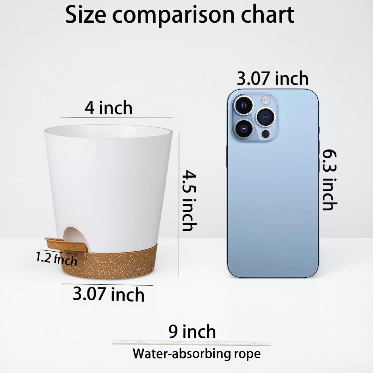 12 Pack 4 Inch Self Watering Plant Pots with Drainage and Saucers,Plastic Flower Pots for Indoor and Outdoor Plants, Nursery Planters for Houseplants and Herbs White Brown, 4 inch 12pcs