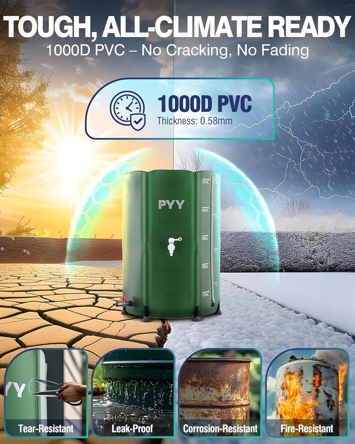 - ๐๐ฎ๐ซ๐๐๐ฅ๐ & ๐๐ญ๐ฎ๐ซ๐๐ฒ: Our rainwater collection barrel is made from high quality 0.5mm thick 1000D PVC, lead-proof, corrosion-resistant, sun-resistant, and crack-resistant. Equipped with 6 robust legs of 1.5mm thickness, the rain storage barrel holds 100 gal water steadily. Enjoy the convenience of irrigation or cleaning in various areas, while our rain water catcher withstands the test of time.
