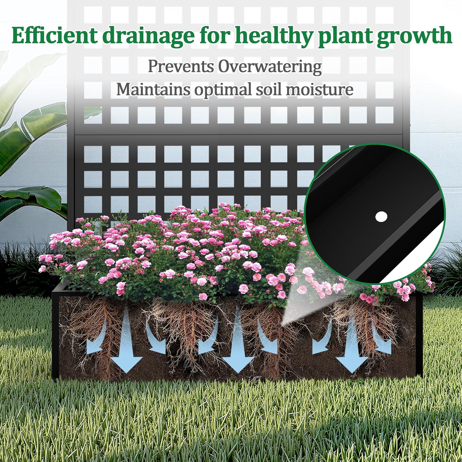 - Optimal Water Management: The planter with trellis features a deep planting bed, offering generous space for healthy root development. The raised garden bed also comes with built-in drainage holes that efficiently prevent water accumulation, helping your plants maintain proper moisture levels for optimal growth.