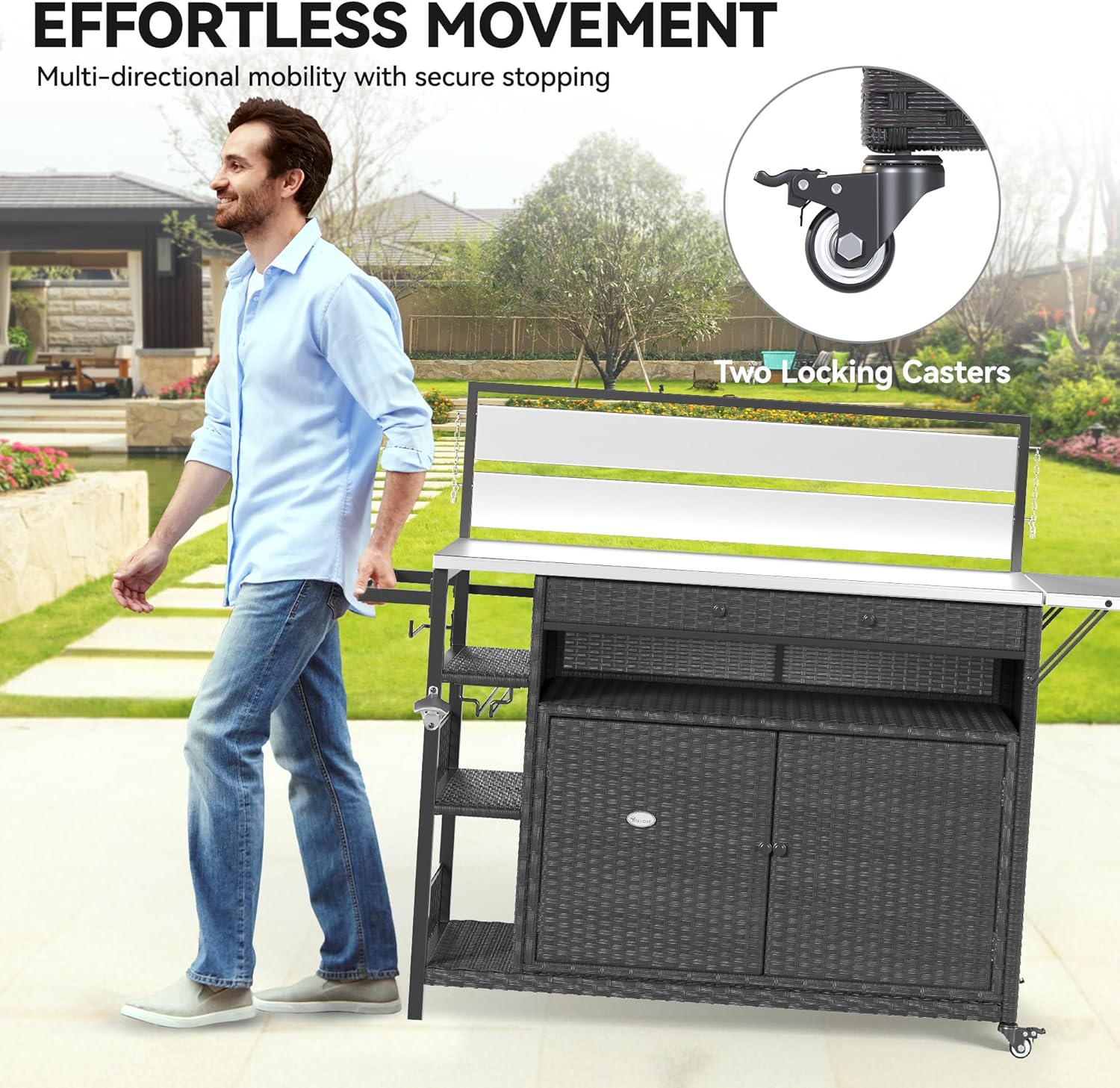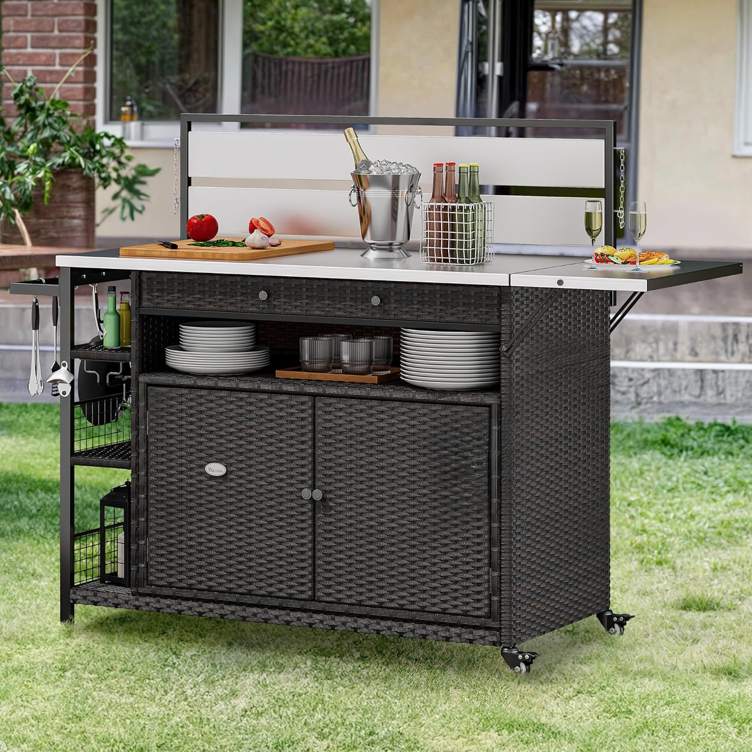 - Sturdy and durable: This rattan outdoor kitchen table features a solid steel frame that's covered in weather-resistant handwoven wicker; Stainless steel countertops are better for outdoor use; Can withstand diverse weather conditions to achieve long-lasting use