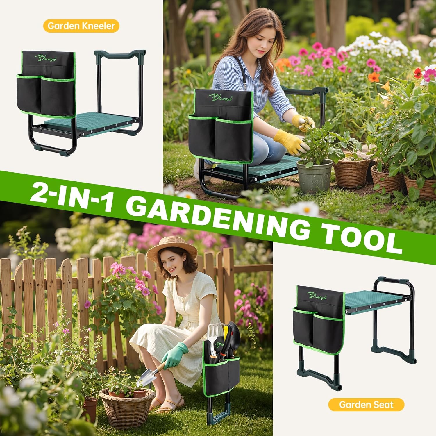 Bluesea Garden Kneeler and Seat - 2-in-1 Heavy Duty Garden Stool & Thick Kneeling Pad with Tool Pouch, Foldable Garden Bench for Planting, Weeding, Seniors, Women (350lbs Capacity)